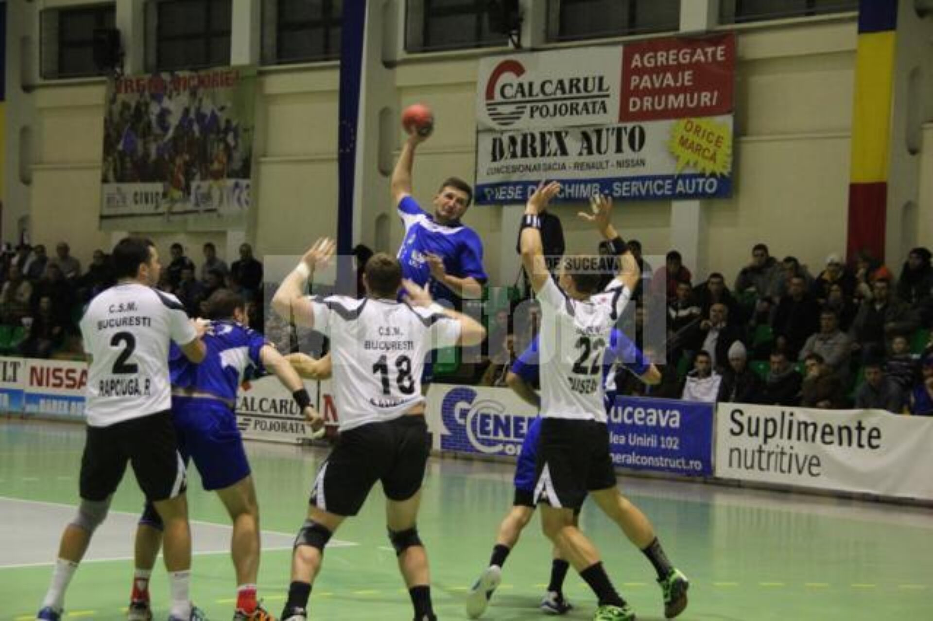 Cu ajutorul câtorva intervenții ale portarului George Șelaru, care a făcut un meci foarte bun, universitarii s-au distanțat la două și mai apoi trei goluri în minutul 14, scor 6-3. O decizie eronată a arbitrilor și două greșeli ale sucevenilor le-au permis oaspeților să egaleze la 6 și la 8. Până la pauză, Universitatea a greșit mai puțin și a intrat la vestiare cu două goluri avans, 12-10. Debutul reprizei secunde a aparținut universitarilor, care s-au distanțat la cinci goluri, după trei reușite ale lui Roșu. Sucevenii s-au dus și la șase goluri, dar din păcate în următorul sfert de oră au avut probleme la finalizare și nu au mai găsit golul, dar s-au apărat destul de bine și oaspeții nu au reușit decât patru goluri.