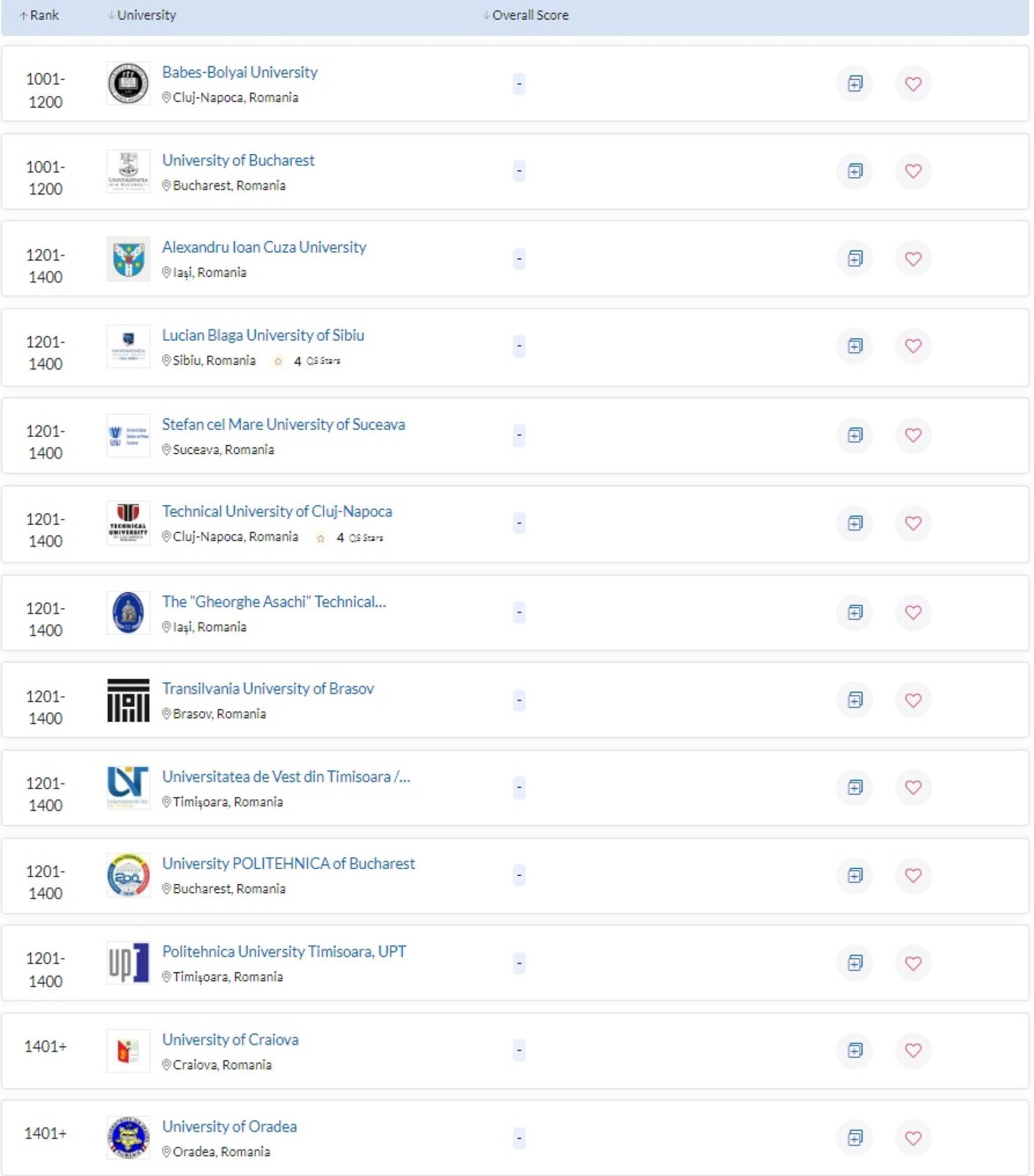 Două universități românești, Universitatea „Babeș-Bolyai” din Cluj-Napoca și Universitatea din București, au fost ierarhizate în eșalonul 1001-1200. Alte nouă universități se regăsesc în eșalonul 1201-1400, după cum urmează: Universitatea „Alexandru Ioan Cuza” din Iași, Universitatea „Lucian Blaga” din Sibiu, Universitatea „Ștefan cel Mare” din Suceava, Universitatea Tehnică din Cluj-Napoca, Universitatea Tehnică „Gheorghe Asachi” din Iași, Universitatea „Transilvania” din Brașov, Universitatea de Vest din Timișoara, Universitatea Politehnica din București și Universitatea Politehnica din Timișoara. În zona de clasament 1401+, se regăsesc Universitatea din Craiova și Universitatea din Oradea.