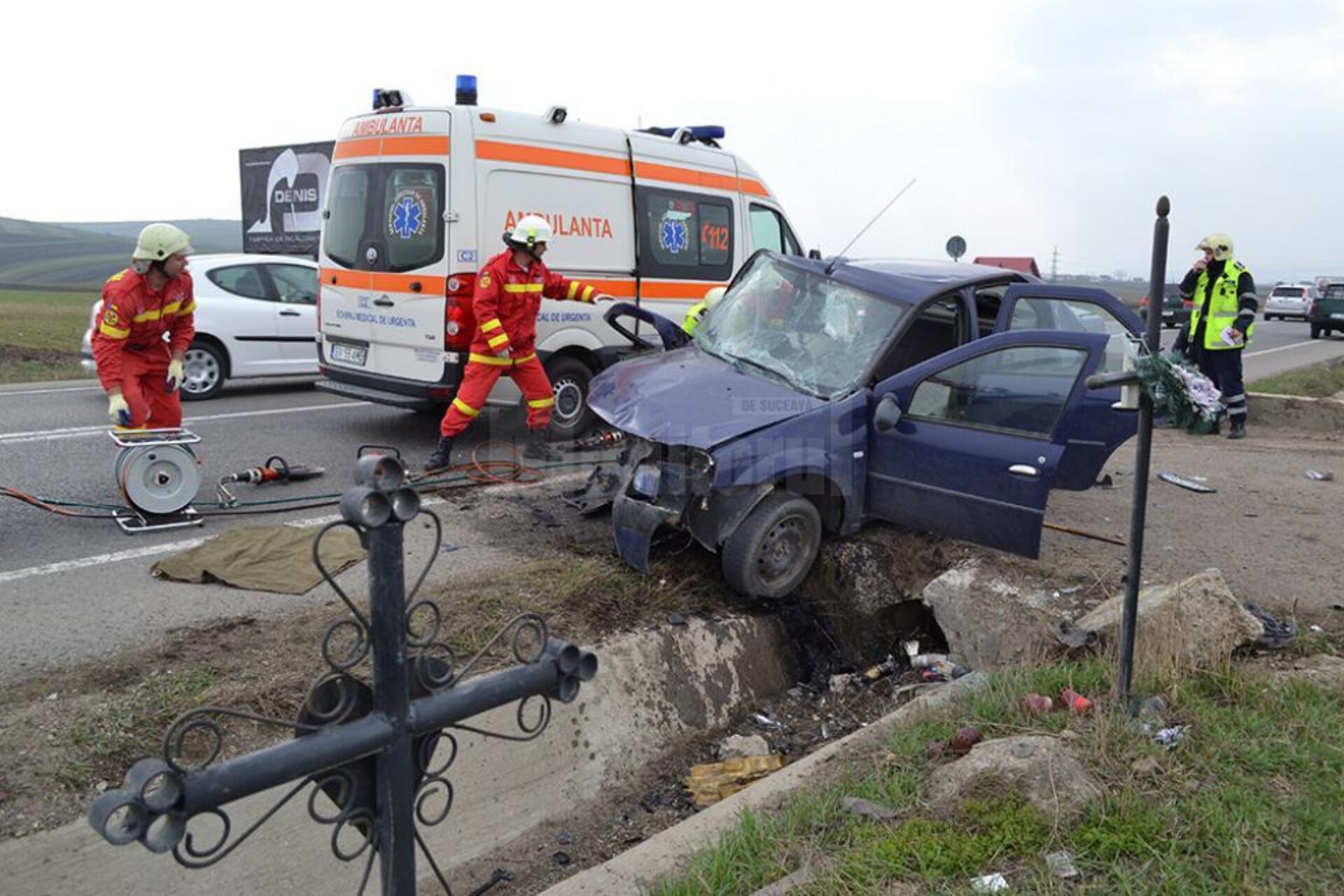 Plutonierul adjutant Alin Găleată, purtătorul de cuvânt al pompierilor militari suceveni, a explicat că s-a intervenit pentru descarcerarea unei femei de pe scaunul din dreapta față și a unui bărbat, pasager pe bancheta din spate, tot în dreapta. Adică exact partea mașinii care a lovit capul de pod.
