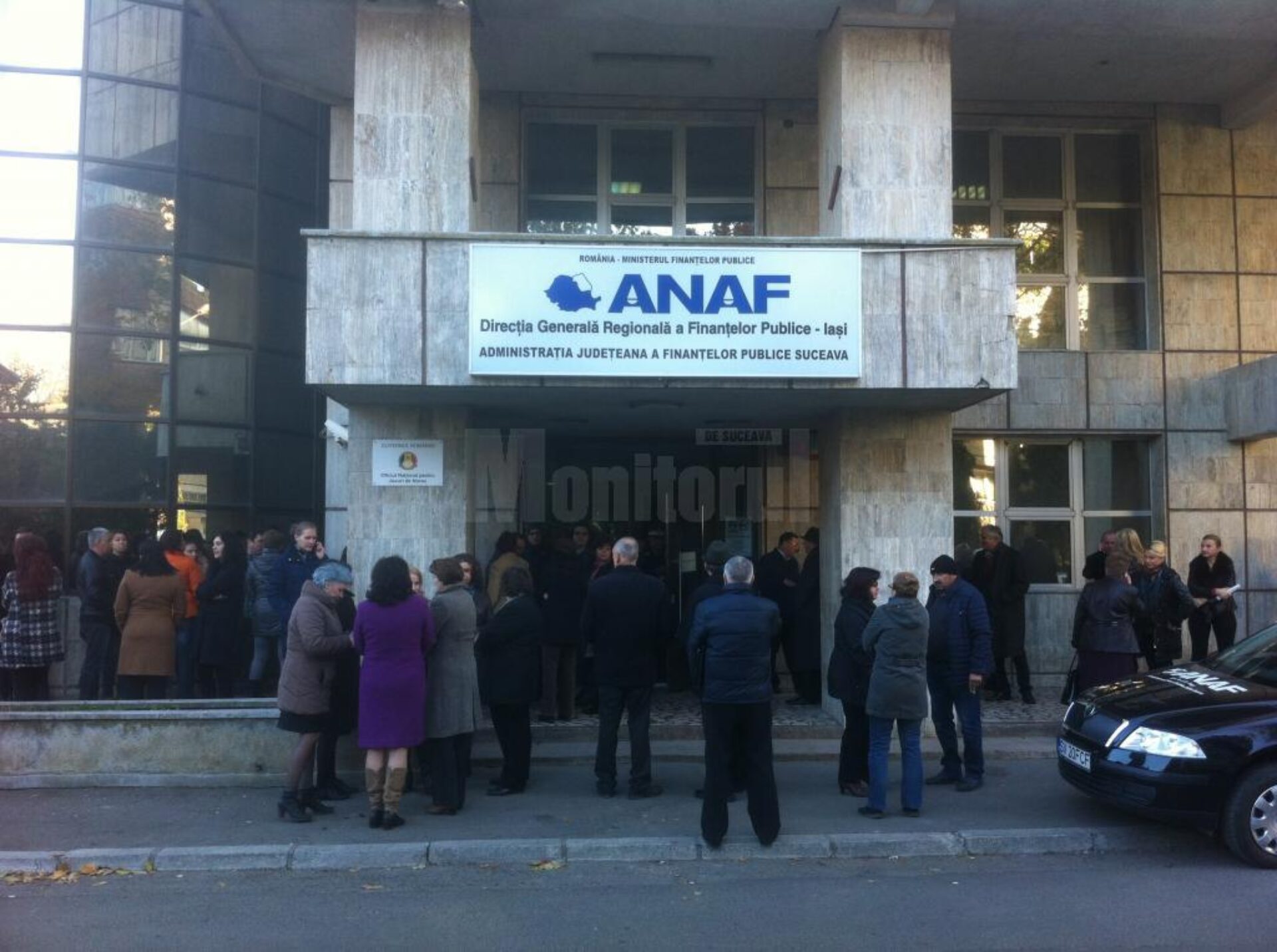 Activitatea Administrației Finanțelor Publice și Trezoreriei Suceava este oprită în totalitate în cursul zilei de marți, 3 noiembrie, după ce angajații instituției au ieșit în stradă încă de la începutul programului, nemulțumiți de o Ordonanță de Urgență a Guvernului României. Peste 200 de salariați ai Finanțelor sucevene participă marți, de la ora 8:00, la o grevă spontană, acțiuni de protest similare având loc în majoritatea județelor din țară.Liderul sindicatului SedLex din cadrul Administrației Finanțelor Publice Suceava, Gheorghiță Tudoscă, a declarat că salariații sunt nemulțumiți de faptul că Executivul a aprobat o Ordonanță de Urgență care a fost publicată vineri în Monitorul Oficial, prin care au fost majorate doar salariile angajaților din aparatul central al Ministerului de Finanțe și Agenției Naționale de Administrare Fiscală, Direcției Generale de Administrare a Marilor Contribuabili, Agenției Naționale de Achiziții Publice și Direcției Generale Antifraudă Fiscală. Gheorghiță Tudoscă a precizat că toți aceștia vor beneficia de o majorare salarială de circa 62% începând cu data de 1 noiembrie 2015. El a adăugat că de această majorare salarială nu beneficiază salariații din administrațiile județene ale finanțelor, direcțiile regionale ale finanțelor și administrațiile sectoarelor din București. „Este o ordonanță discriminatorie atât timp cât noi facem aceleași lucruri pe care le fac și ei, poate chiar mai mult. Probabil ei nu știu cum se muncește la administrația financiară, cât se muncește și cât se stă peste program”, a spus liderul de sindicat.Gheorghiță Tudoscă a declarat că protestul va continua până când salariații vor primi un răspuns clar de la conducerea ANAF și a Ministerului de Finanțe cu privire la motivele pentru care au fost excluși din această ordonanță.
