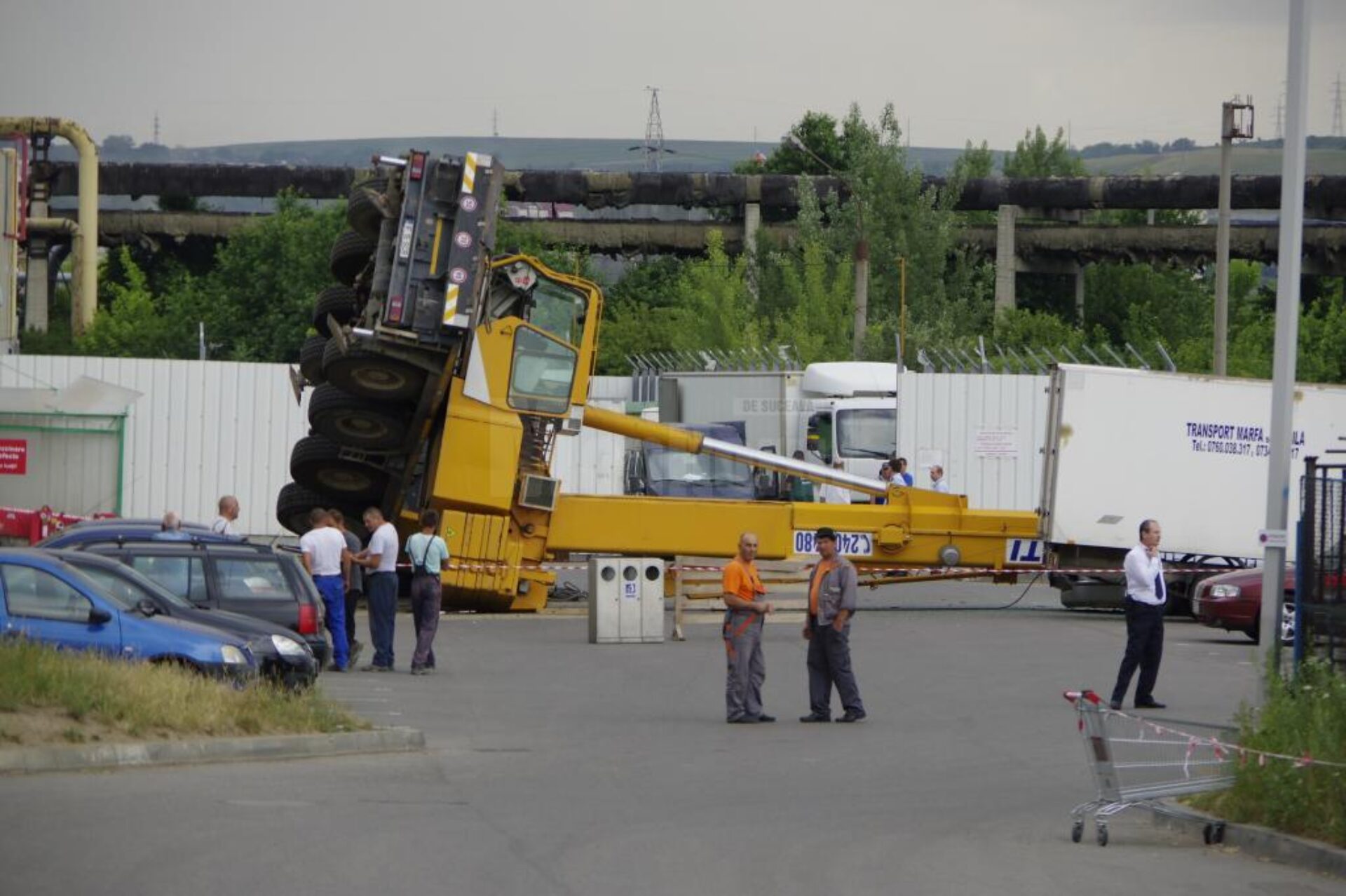 O automacara care efectua o manevră în spatele complexului comercial Iulius Mall Suceava s-a răsturnat miercuri peste două mașini care se aflau în parcarea din zonă. Accidentul s-a petrecut în jurul orei 11.45, în parcarea destinată aprovizionării cu marfă a centrului comercial. Brațul macaralei a distrus complet un autoturism înmatriculat în Bulgaria și parțial o autoutilitară. Din fericire, în zonă nu se afla nici o persoană.