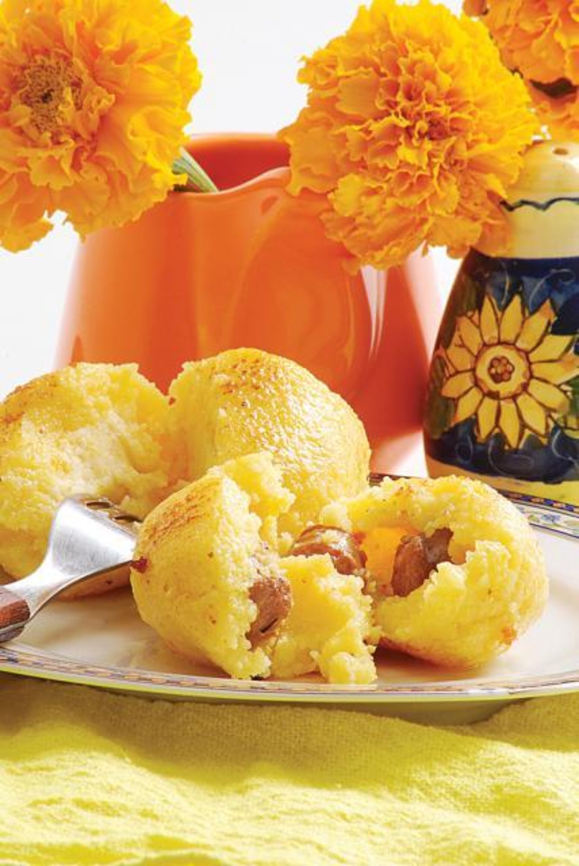 În jumătate din bile, care la noi se cheamă „urși” băgați brânză și în cealaltă jumătate cârnăciori prăjiți.