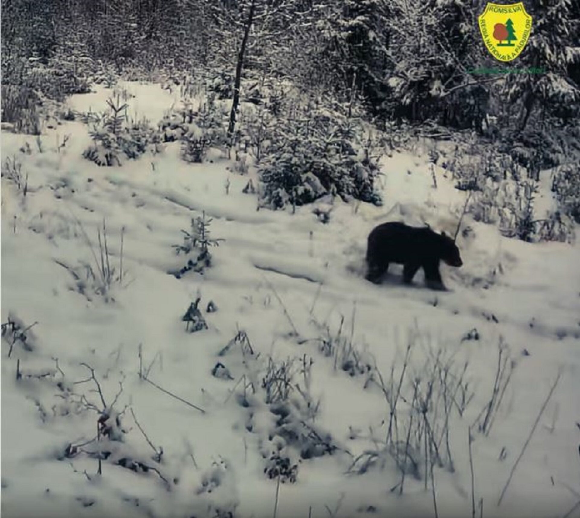 Un urs cu chef de joacă a fost filmat recent, când încă zăpada se menținea, într-o pădure administrată de Ocolul Silvic Mălini din cadrul Direcției Silvice Suceava.