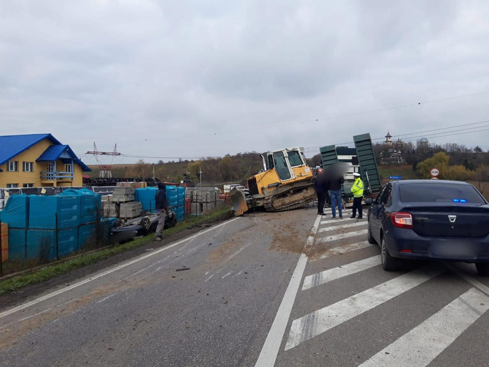 Un accident rutier atipic a avut loc vineri pe raza localității Fântâna Mare. Un utilaj care era transportat pe o platformă a căzut peste două autoturisme.
