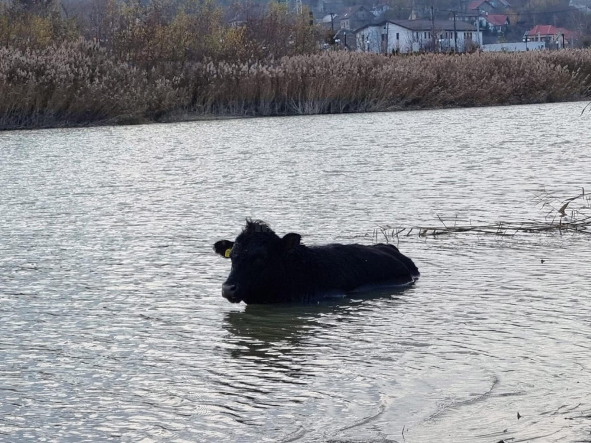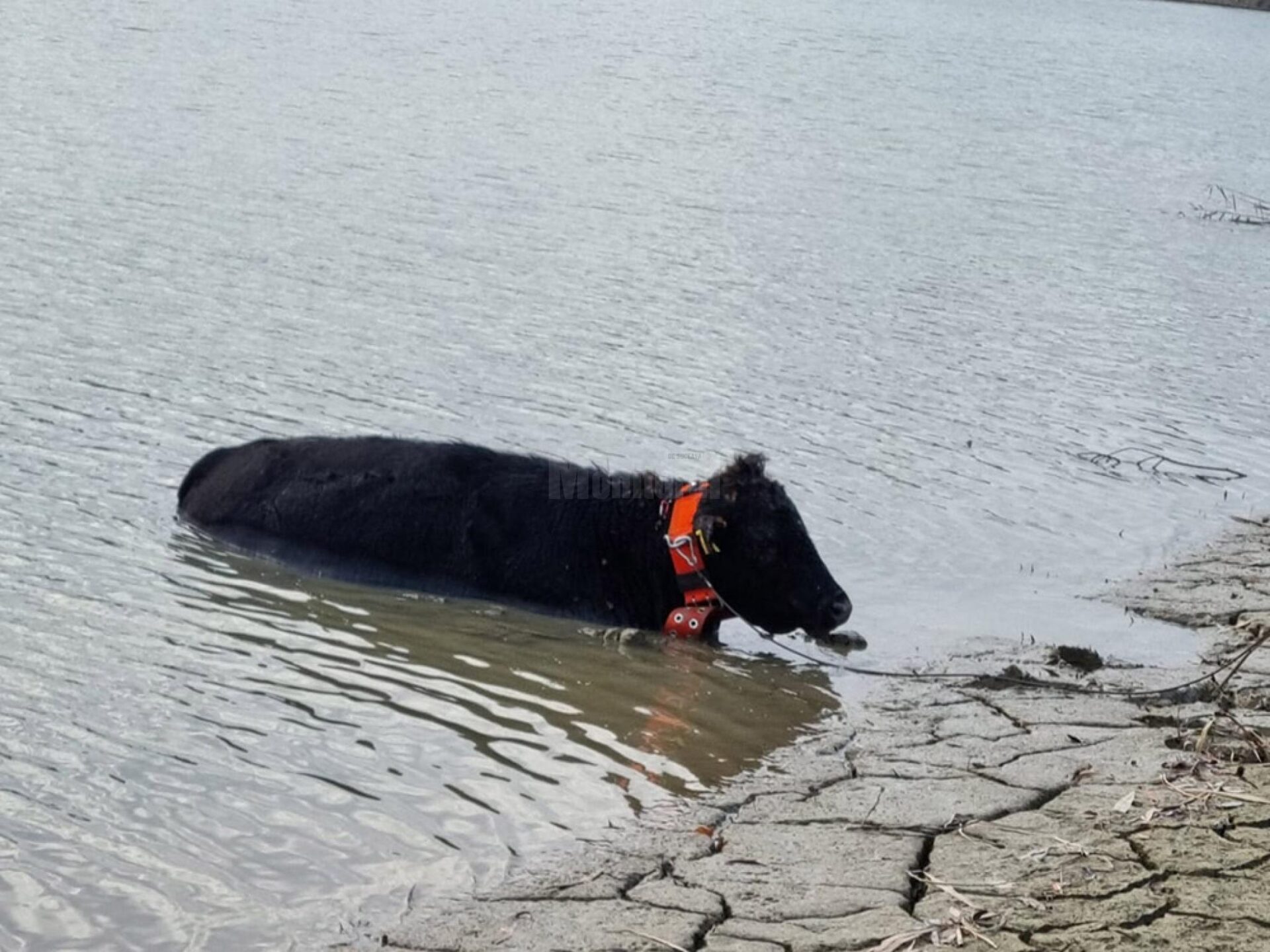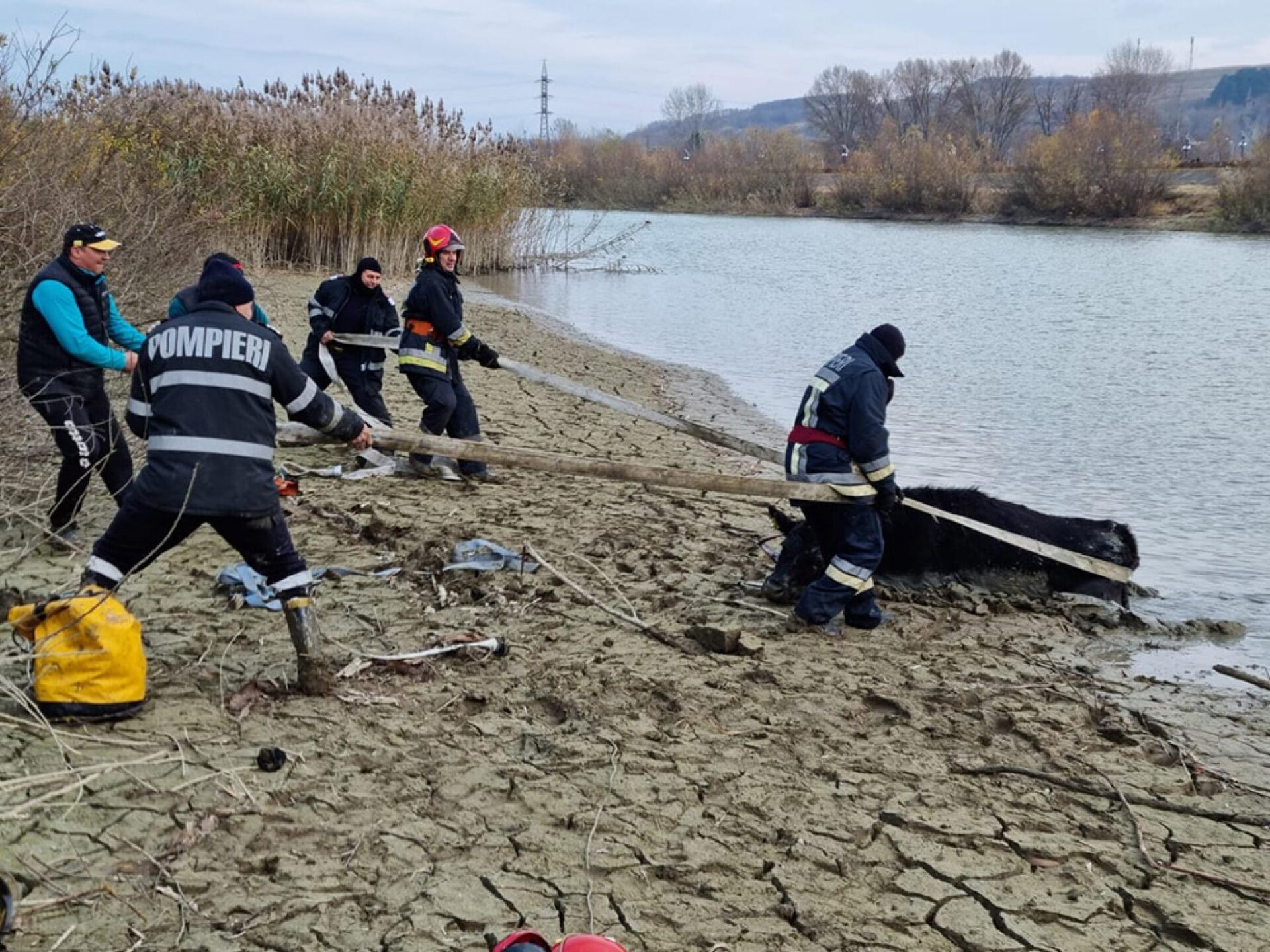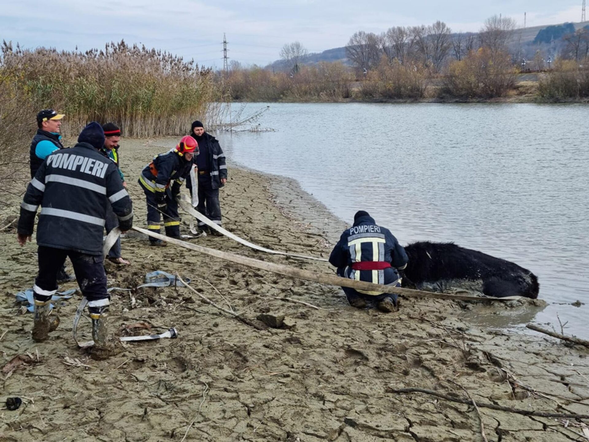 Când echipajul de pompieri a ajuns la fața locului, două dintre bovine reușiseră să iasă singure din apă. A treia era însă împotmolită în mâl și în imposibilitatea de a se mișca.