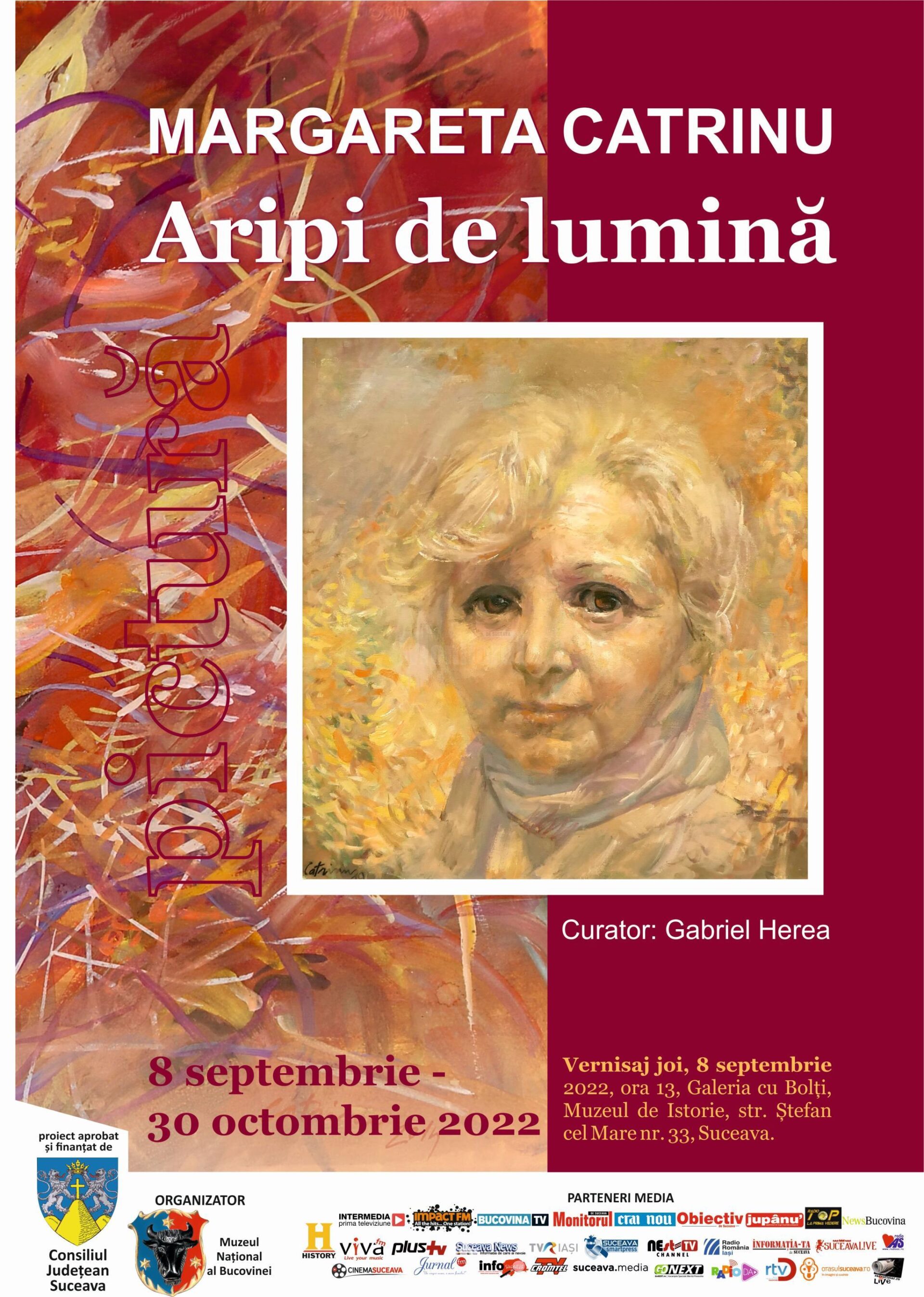 Muzeul Național al Bucovinei invită publicul iubitor de artă joi, 8 septembrie 2022, la ora 13:00, la Muzeul de Istorie, la vernisajul expoziției de pictură „Aripi de lumină”, semnată de pictorița Margareta Catrinu. Aproape 90 de lucrări, realizate în diferite perioade de creație ale artistei, vor putea fi văzute până pe 30 octombrie 2022, în Galeria cu Bolți a Muzeului de Istorie.