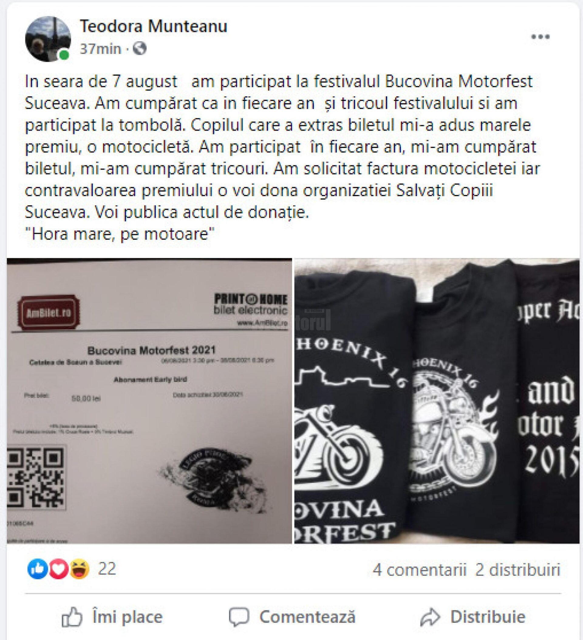 “În seara zilei de 7 august 2021 am participat, ca în fiecare an, la festivalul Bucovina Rockfest, organizat de către Asociația Legio Phoenix MC Suceava, în condiții impecabile. Cu această ocazie a fost organizată tombola, la care am participat și eu ca urmare a cumpărării tricoului festivalului. Numele meu a fost extras din urna cu sute de bilete de către băiatul solistului trupei ”Urma” . Nu e un secret că particip la festivalurile rock, prietenii mei știu acest lucru. Dacă sorții s-au rostogolit către mine, am decis să achit contravaloarea acelui premiu, în sumă de 5000 RON, iar banii sa fie direcționați către Asociația ”Salvați Copiii Suceava” . Este o motocicletă second-hand și voi avea mare grijă de ea”, este mesaj postat pe pagina de reprezentant al USR.