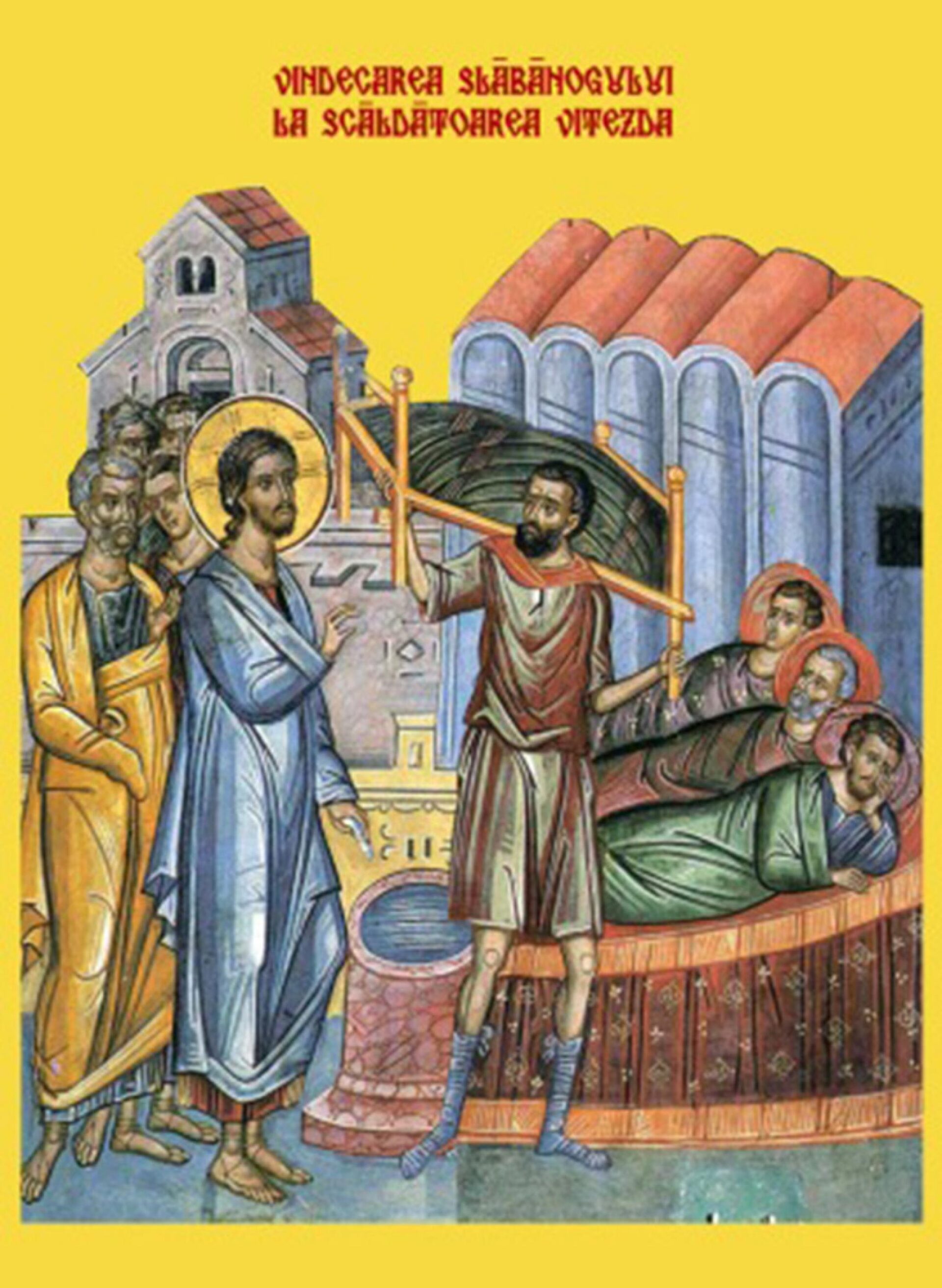 „În vremea aceea era o sărbătoare a iudeilor și Iisus S-a suit la Ierusalim. Iar în Ierusalim, lângă Poarta Oilor, era o scăldătoare, care se numea pe evreiește Vitezda, având cinci pridvoare. În acestea zăcea mulțime de bolnavi: orbi, șchiopi, uscați, așteptând mișcarea apei. Căci un înger al Domnului se cobora din când în când în scăldătoare și tulbura apa, și cine intra întâi după tulburarea apei, se făcea sănătos de orice boală era cuprins. Și era acolo un om care era bolnav de treizeci și opt de ani. Iisus, văzându-l pe acesta zăcând și, știind că este așa încă de multă vreme, i-a zis: Voiești să te faci sănătos? Bolnavul I-a răspuns: Doamne, nu am om ca să mă arunce în scăldătoare, când se tulbură apa; că, până când vin eu, altul se coboară înaintea mea. Iisus i-a zis: Scoală-te, ia-ți patul tău și umblă! Și îndată omul s-a făcut sănătos, și-a luat patul și umbla. Dar în ziua aceea era sâmbătă. Deci ziceau iudeii către cel vindecat: Este zi de sâmbătă și nu este îngăduit să-ți iei patul. El le-a răspuns: Cel ce m-a făcut sănătos, Acela mi-a zis: Ia-ți patul tău și umblă. Ei l-au întrebat: Cine este omul care ți-a zis: Ia-ți patul tău și umblă? Iar cel vindecat nu știa cine este, căci Iisus Se dăduse la o parte din mulțimea care era în acel loc. După aceasta, Iisus l-a aflat în templu și i-a zis: Iată că te-ai făcut sănătos. De acum să nu mai păcătuiești, ca să nu ți se întâmple ceva mai rău. Atunci, omul a plecat și a spus iudeilor că Iisus este Cel Care l-a făcut sănătos.” (Ioan 5, 1-15)