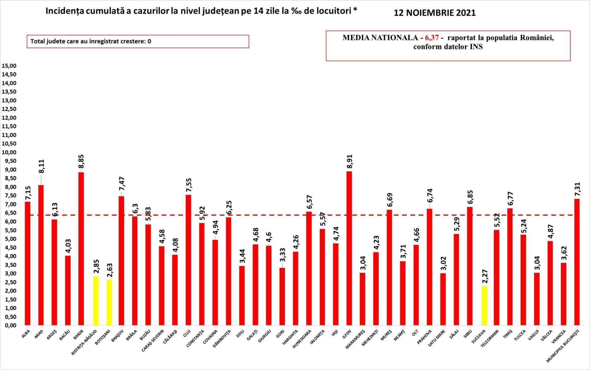 De asemenea, se menține ridicat numărul internărilor persoanelor diagnosticate cu Covid și care au forme de boală care necesită spitalizare. În intervalul 11-12 noiembrie au fost internați în spitalele din județ 36 de pacienți cu Covid și au fost externați tot atâția. În aceeași perioadă de referință au murit 7 oameni din cauza Covid. Din totalul celor 621 pacienți internați în Spitalul Județean de Urgență „Sf. Ioan cel Nou” Suceava, 134 pacienți sunt cu Covid, 24 de pacienți sunt în zona tampon și 463 de pacienți sunt cu alte afecțiuni (non-Covid). Din cei 134 de pacienți cu Covid, unul are formă ușoară, 54 au forme medii de boală, 61 au forme severe și 18 sunt cu forme grave de Covid, internați la ATI. 11 pacienți sunt ventilați non-invaziv și 5 pacienți sunt intubați, ventilați invaziv.