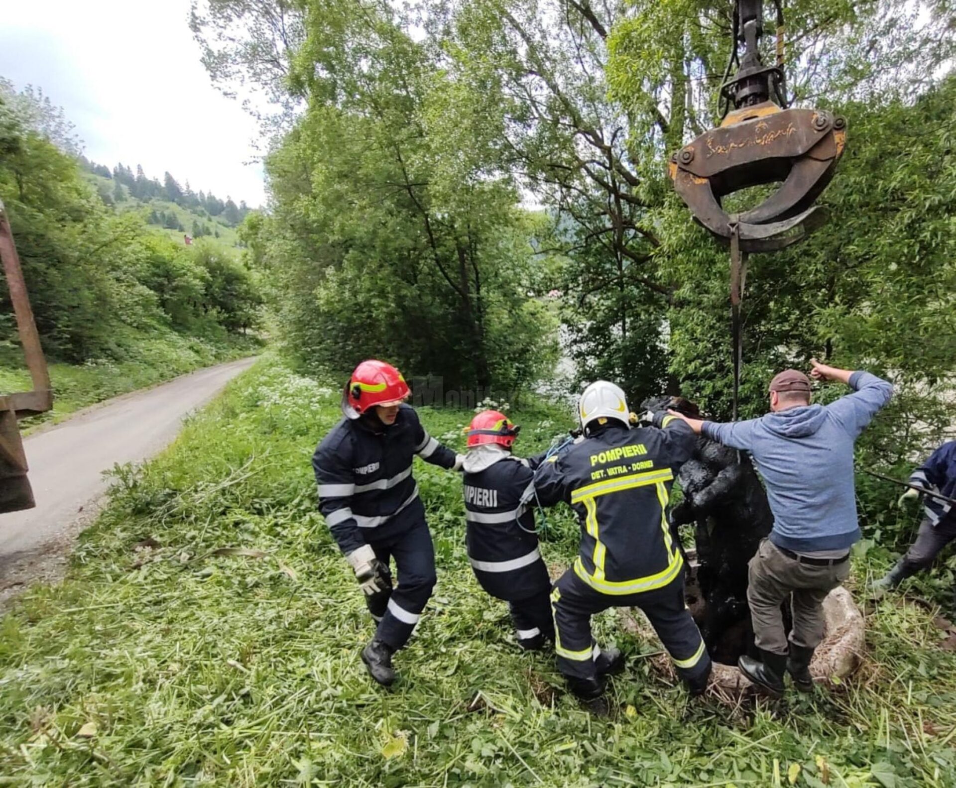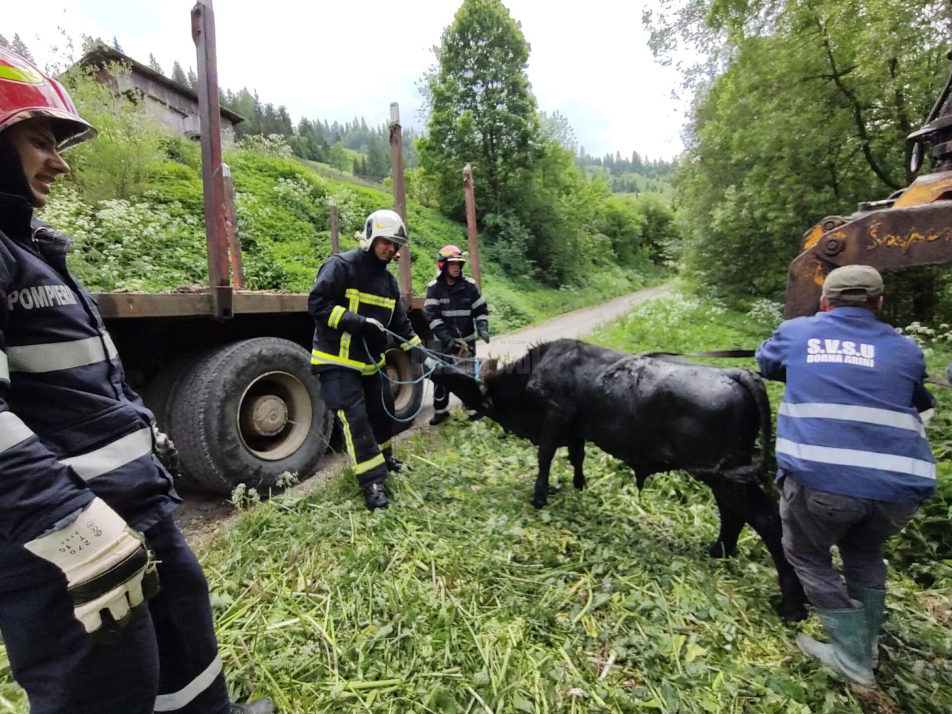 Misiune atipică pentru pompierii din Vatra Dornei, care sâmbătă au fost solicitați să salveze un vițel care căzuse într-o fosă septică din Dorna Arini. Animalul se afla la o adâncime de circa 4 metri și se chinuia îngrozitor. Având în vedere greutatea vițelului, pompierii au apelat și la autoritățile locale din Dorna Arini, care au trimis la fața locului o autoplatformă cu braț hidraulic. Totul a durat circa 30 minute, iar după ce vițelul a putut fi prins în chingi s-a reușit aducerea lui la sol în condiții de siguranță.
