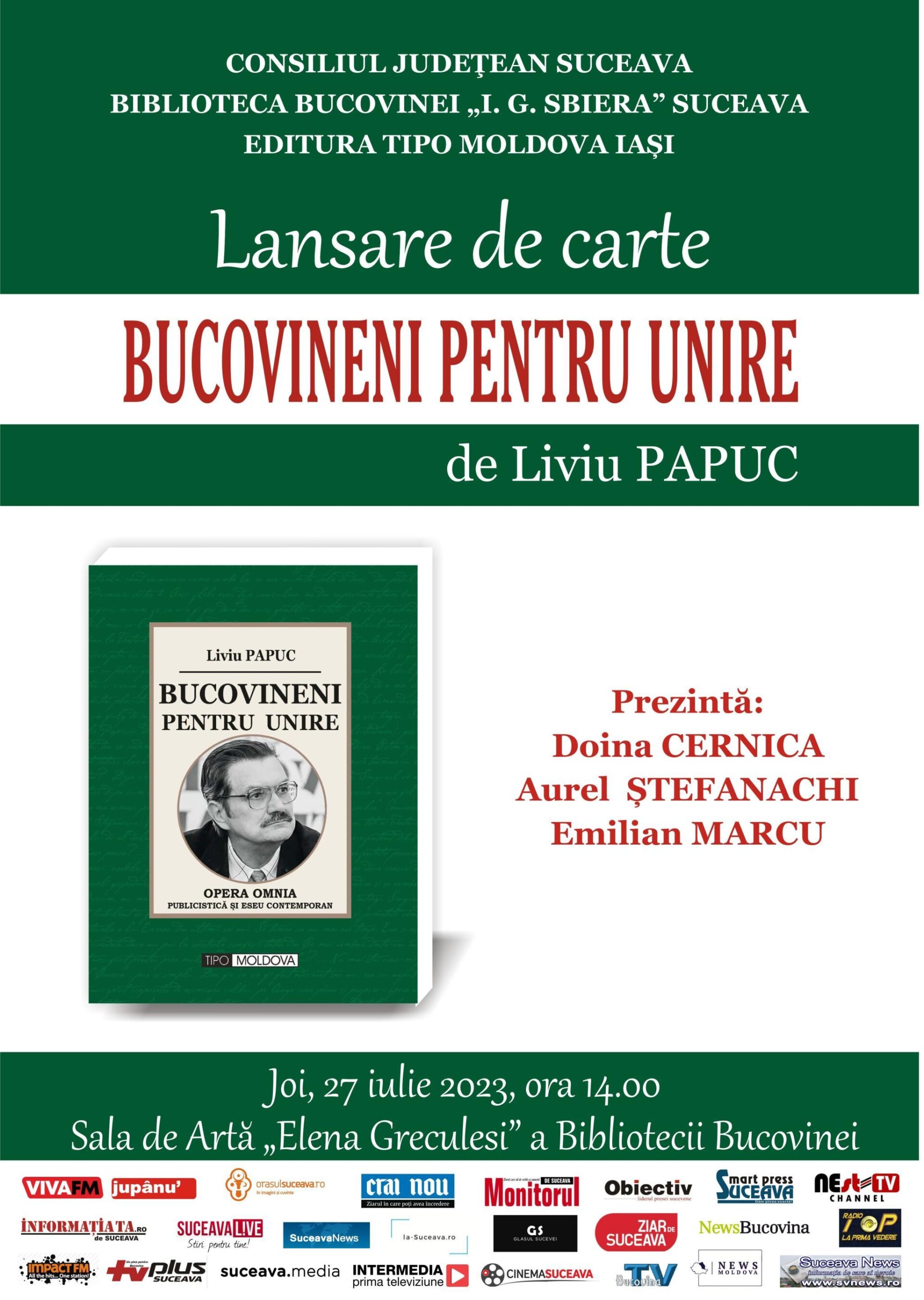 La Biblioteca Bucovinei „I.G. Sbiera”, în Sala de Artă „Elena Greculesi”, va avea loc joi, 27 iulie 2023, de la ora 14:00, lansarea volumului „Bucovineni pentru unire” de Liviu Papuc. Cartea va fi prezentată de Doina Cernica, Aurel Ștefanachi și Emilian Marcu.