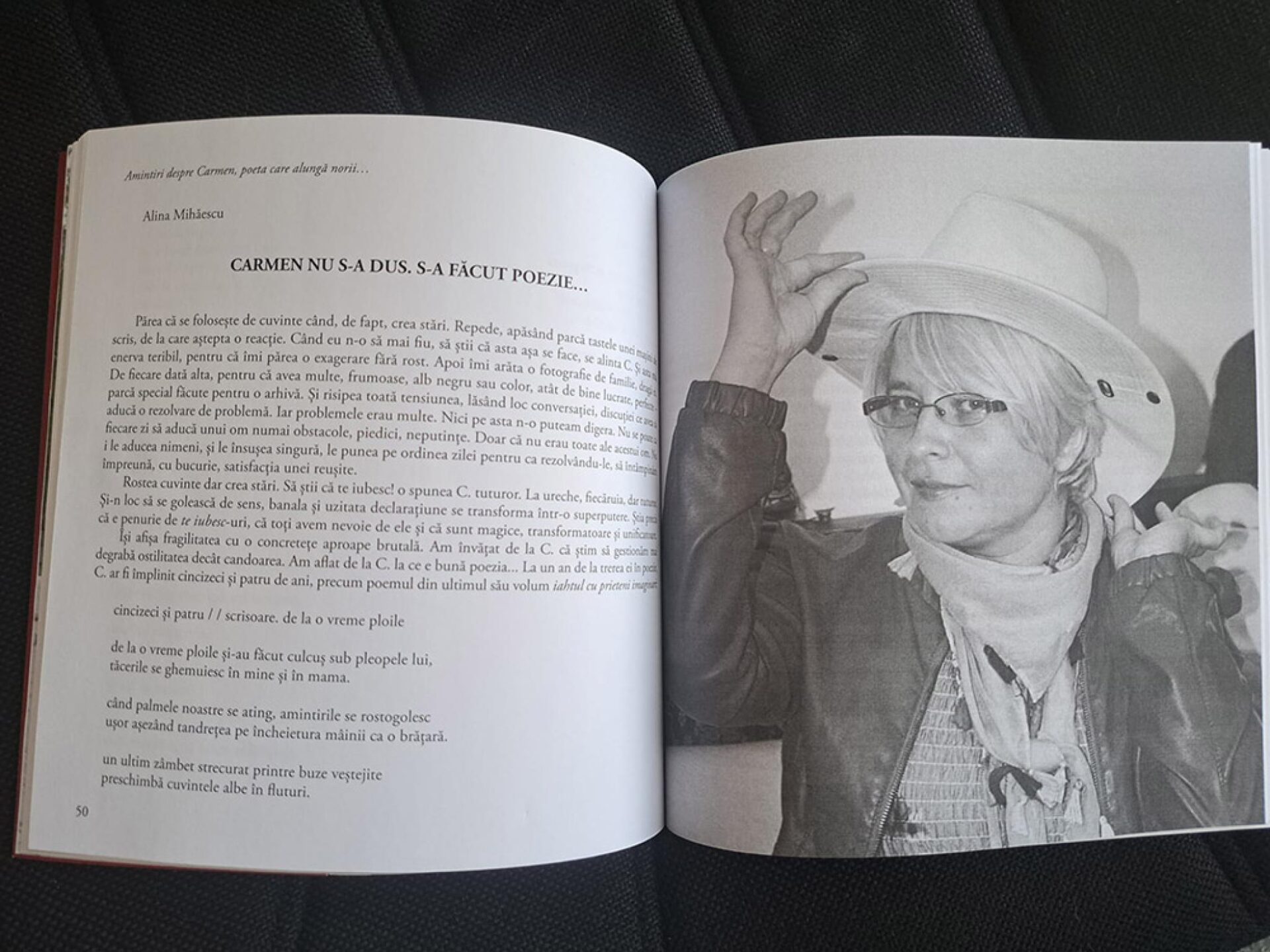 Au scris despre Carmen, în ordinea din „Sumar”, Ion Lungu, primarul Sucevei, care o considera „sufletul teatrului sucevean”, scriitori, oameni din lumea teatrului, jurnaliști, oameni de cultură: Constantin Arcu, Muriel Augry, Sorin Avram, George Banu, Răzvan Bănuț, Leo Butnaru, Eveline Caduc, Călin Ciobotari, Doina Cernica, Loredana Dalian, Gellu Dorian, Mihaela Grădinariu, Grigore Ilisei, Margareta Labiș, Delu Lucaci, Ioan Manole, Alina Mihăescu, Carmen Mihalache, Violeta Păsat, Mihai Pânzaru PIM, Viorica Petrovici, Clara Popadiuc, Adrian Dinu Rachieru, Elena Simionovici, Elena Brândușa Steiciuc, Liviu -Ioan Stoiciu, Adela Șulea, Daniel Tănase, Alain Timár, Viorel Ioan Vârlan, Ovidiu Alexandru Vintilă, Matei Vișniec, Angela Zarojanu. Volumul conține, de asemenea, proiectul de cercetare cu care Carmen a fost admisă la Școala Doctorală de Teatru a Universității Naționale de Arte „George Enescu” din Iași, „Elemente poetice în teatrul lui Matei Vișniec. De la text la spectacol”. Mulți dintre cei care au scris au evocat momentele primei întâlniri cu Carmen Steiciuc, personalitatea poetei, dar și conversații avute cu ea în ultimele zile ale vieții, când a rămas la fel de luminoasă, deși își simțea sfârșitul aproape.
