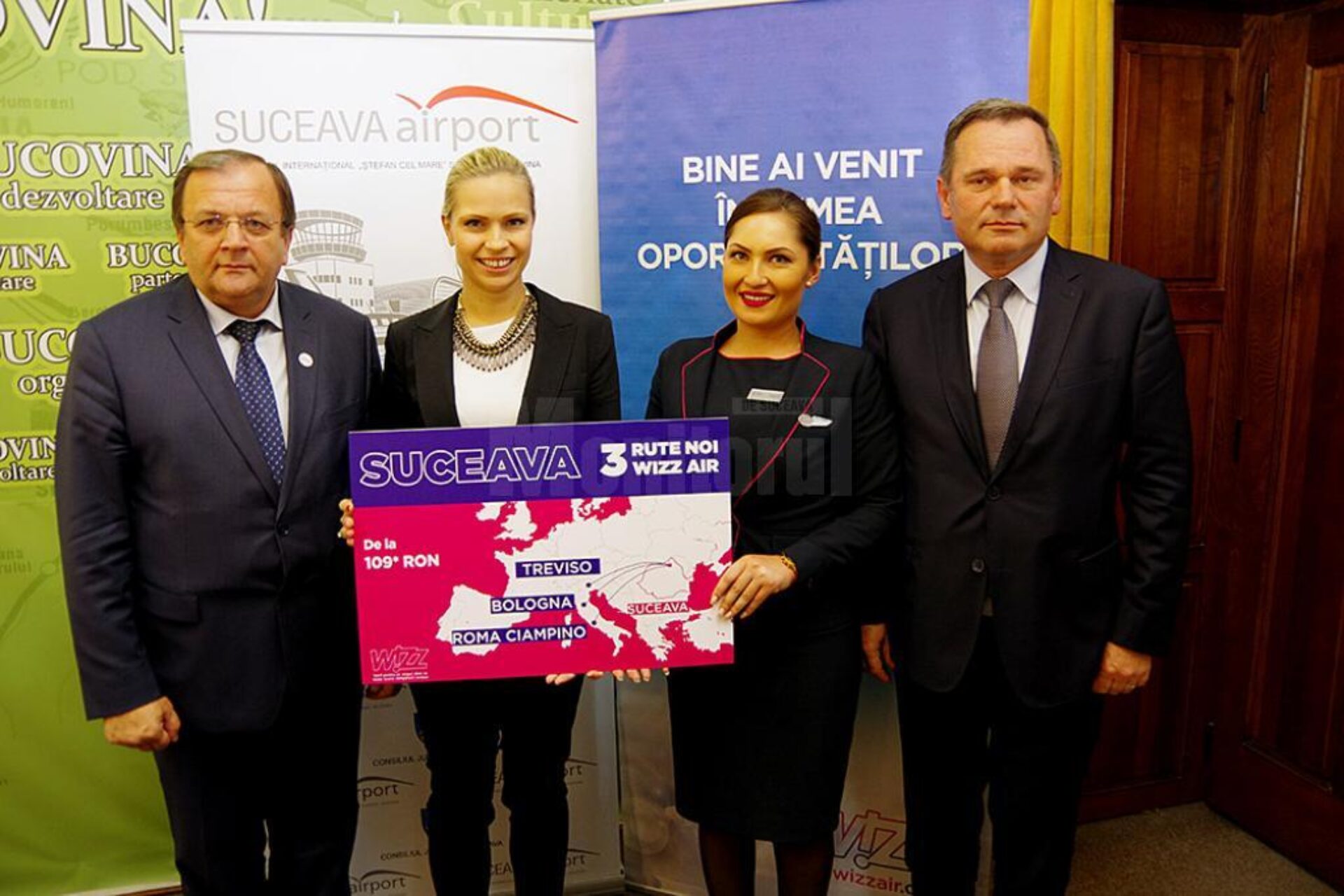 Wizz Air a anunțat, în mod oficial, prin directorul de comunicare al companiei, Tamara Vallois, că începând din luna martie 2017 de pe Aeroportul Internațional „Ștefan cel Mare” Suceava vor fi operate zboruri către trei noi destinații, toate în Italia, respectiv Roma – Ciampino, Veneția – Treviso și Bologna. Tamara Vallois a făcut acest anunț în cadrul unei conferințe de presă pe care a susținut-o la Palatul Administrativ împreună cu președintele Consiliului Județean Suceava, Gheorghe Flutur, și directorul Aeroportului „Ștefan cel Mare”, Ioan Măriuța. Directorul de comunicare al Wizz Air a remarcat încă de la începutul conferinței de presă că la doar trei luni de la sărbătorirea primului zbor al companiei de pe Aeroportul Suceava, Wizz Air anunță încă trei noi destinații externe.