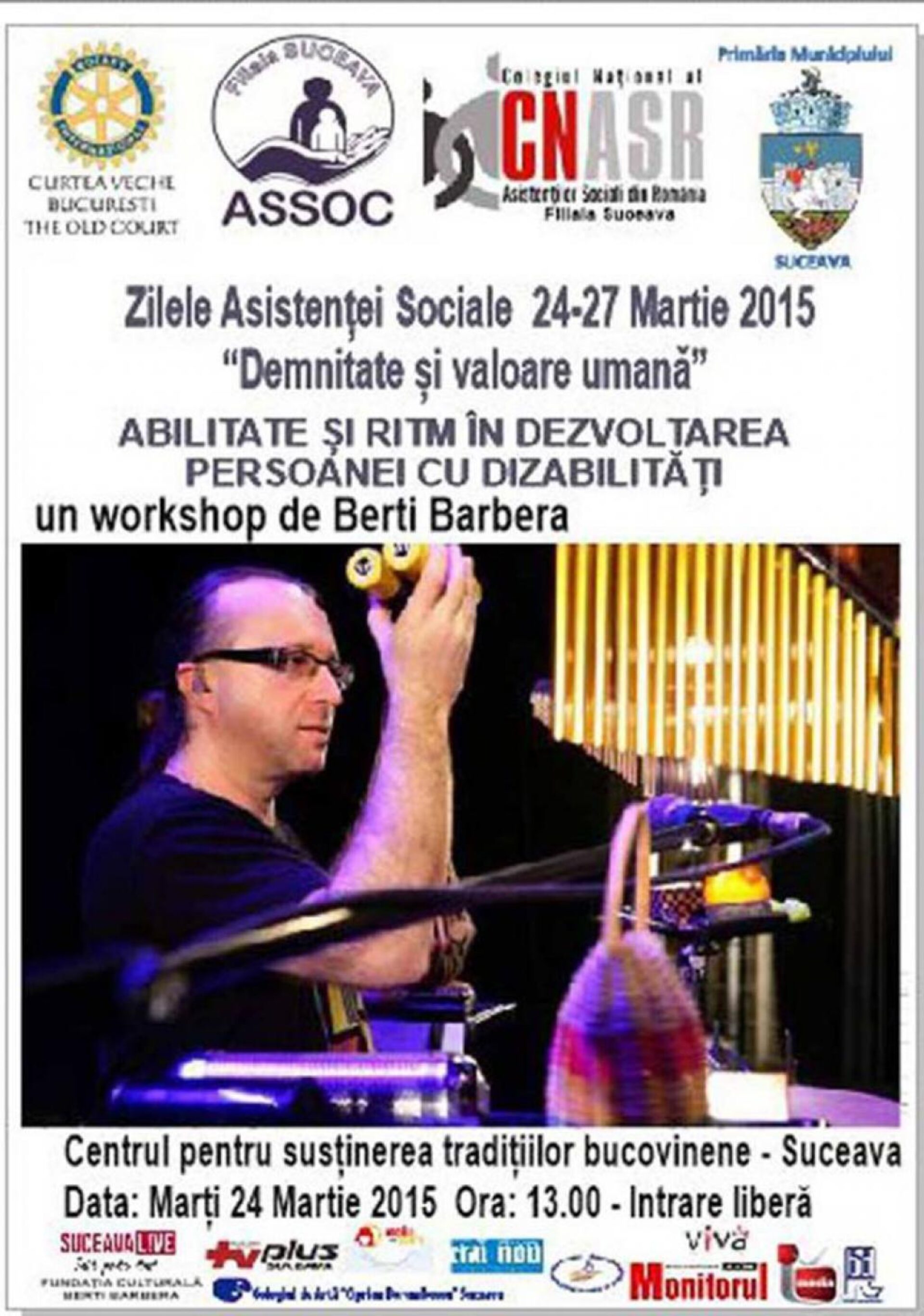 La Centrul pentru Susținerea Tradițiilor Bucovinene din municipiul Suceava va avea loc marți, 24 martie, la ora 13.00, cu prilejul marcării Zilelor Asistenței Sociale (24-27 martie), organizate sub genericul „Demnitate și valoare umană”, un workshop despre abilitate și ritm în dezvoltarea persoanei cu dizabilități susținut de muzicianul Berti Barbera. Intrarea este liberă.