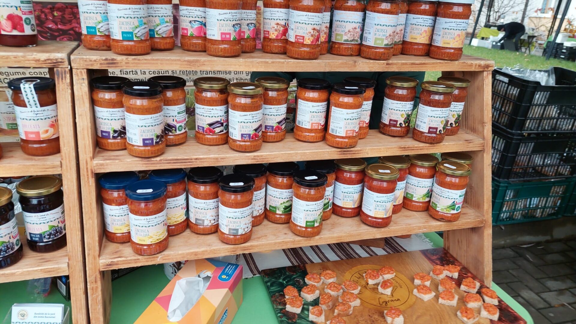 Alături de el, Domnica Covalschi, din Cajvana, oferă spre vânzare zacuscă și dulceață. Pe tarabă sunt borcane cu zacuscă de praz, de mere și morcov, cu hribi, cu opintici, cu mix de ciuperci, cu boabe de fasole, cu păstăi, cu dovleac plăcintar, precum și diverse sortimente de dulceață și siropuri.