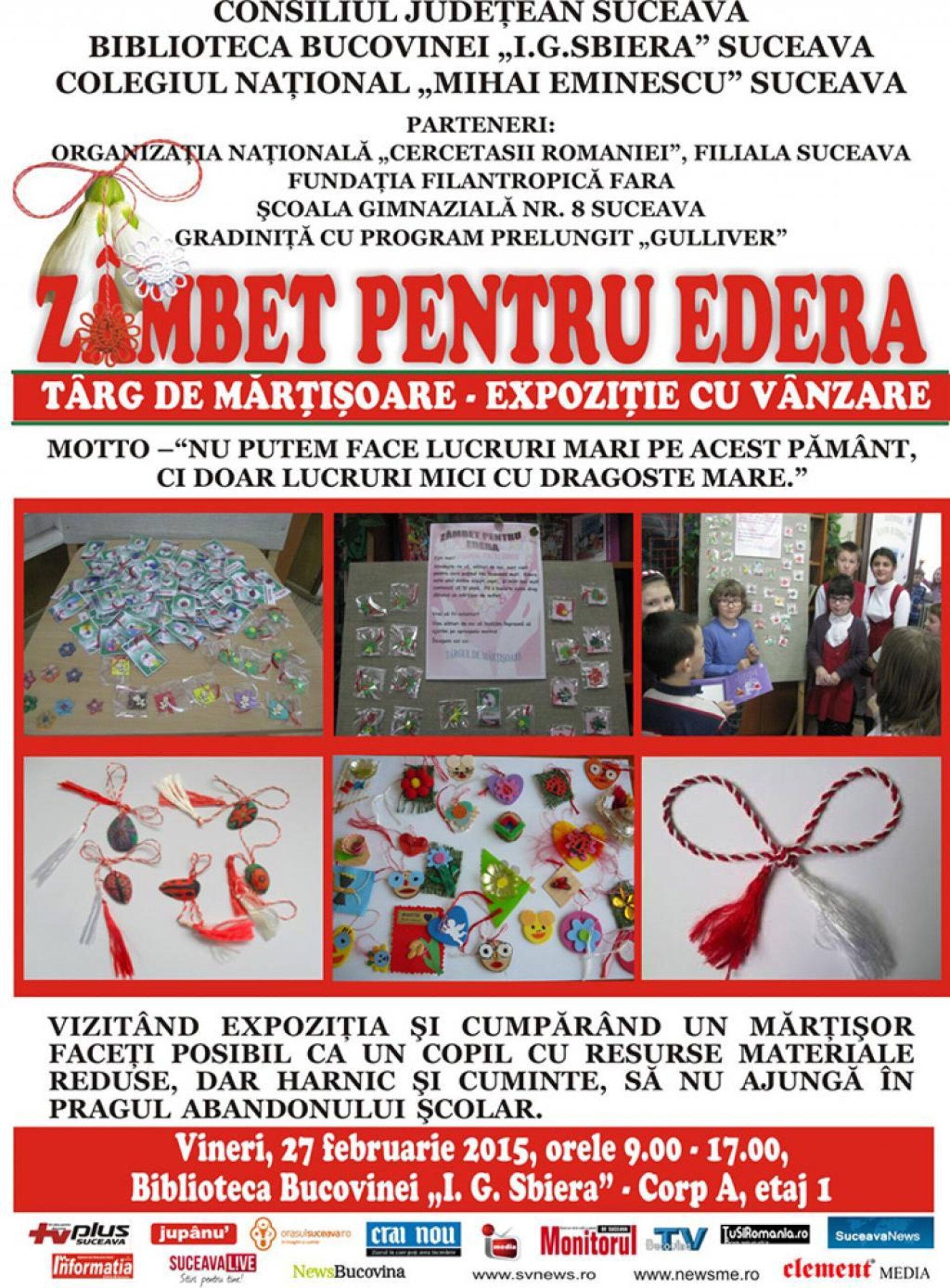 Biblioteca Bucovinei „I.G. Sbiera” și Colegiul Național „Mihai Eminescu” Suceava organizează vineri, 27 februarie, între orele 9.00 – 17.00, la biblioteca publică suceveană (Corp A, etaj I), sub egida Consiliului Județean Suceava, având ca parteneri Organizația Națională „Cercetașii României” – Filiala Suceava, Fundația filantropică FARA, Școala Gimnazială nr. 8 Suceava și Grădinița cu program prelungit „Gulliver”, sub genericul „Zâmbet pentru Edera” și având ca motto „Nu putem face lucruri mari pe acest pământ, ci doar lucruri mici cu dragoste mare”, un târg de mărțișoare – expoziție cu vânzare. Prin vizitarea expoziției și cumpărarea unui mărțișor, vizitatorii fac posibil ca un copil, cu resurse materiale reduse dar harnic și cuminte, să nu ajungă în pragul abandonului școlar.