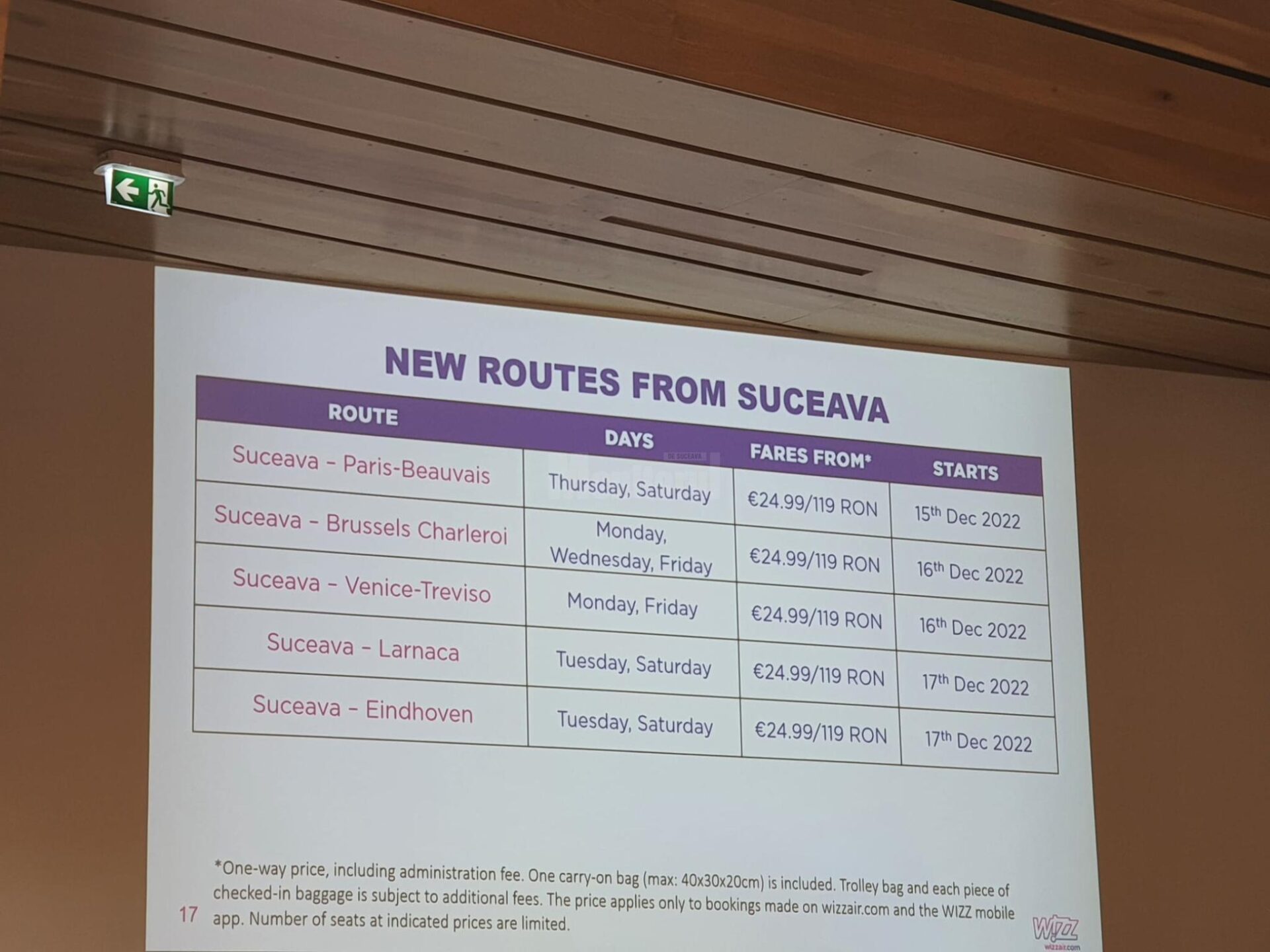 Compania Wizz Air a anunțat, miercuri, cinci noi curse externe de la Aeroportul Internațional „Ștefan cel Mare” Suceava, către Franța, Belgia, Italia, Cipru și Olanda, începând din 15 decembrie a.c.. Astfel, către Paris-Beauvais (Franța) vor fi două zboruri pe săptămână, în zilele de joi și sâmbătă; către Bruxelles- Charleroi (Belgia), trei zboruri pe săptămână, în zilele de luni, miercuri și vineri; Veneția-Treviso (Italia), două zboruri pe săptămână în zilele de luni și vineri; Larnaca (Cipru) – două zboruri pe săptămână, marți și sâmbătă; Eindhoven (Olanda) – două zboruri pe săptămână, marți și sâmbătă. Biletele sunt deja puse în vânzare, la prețuri începând cu 24,99 euro.