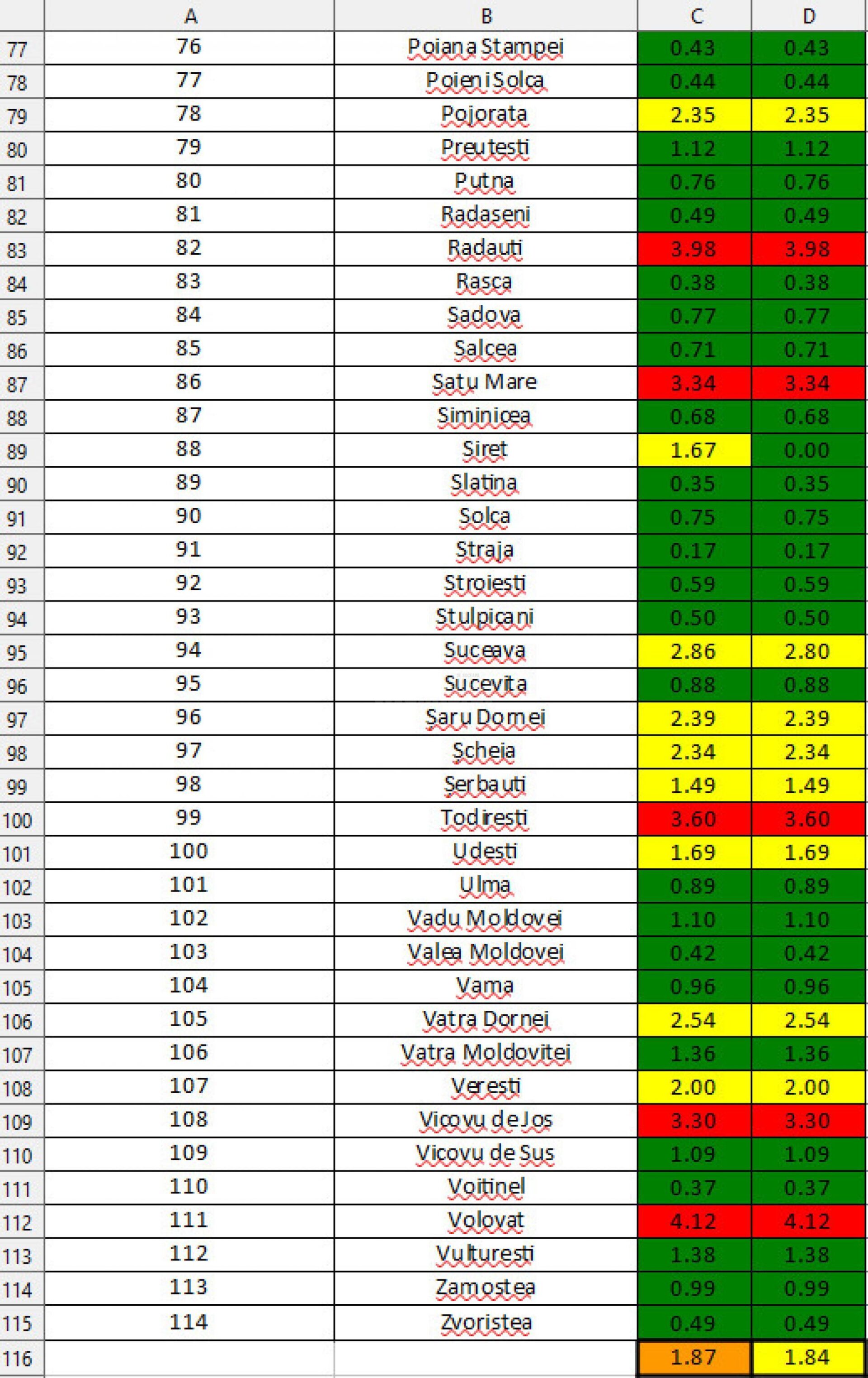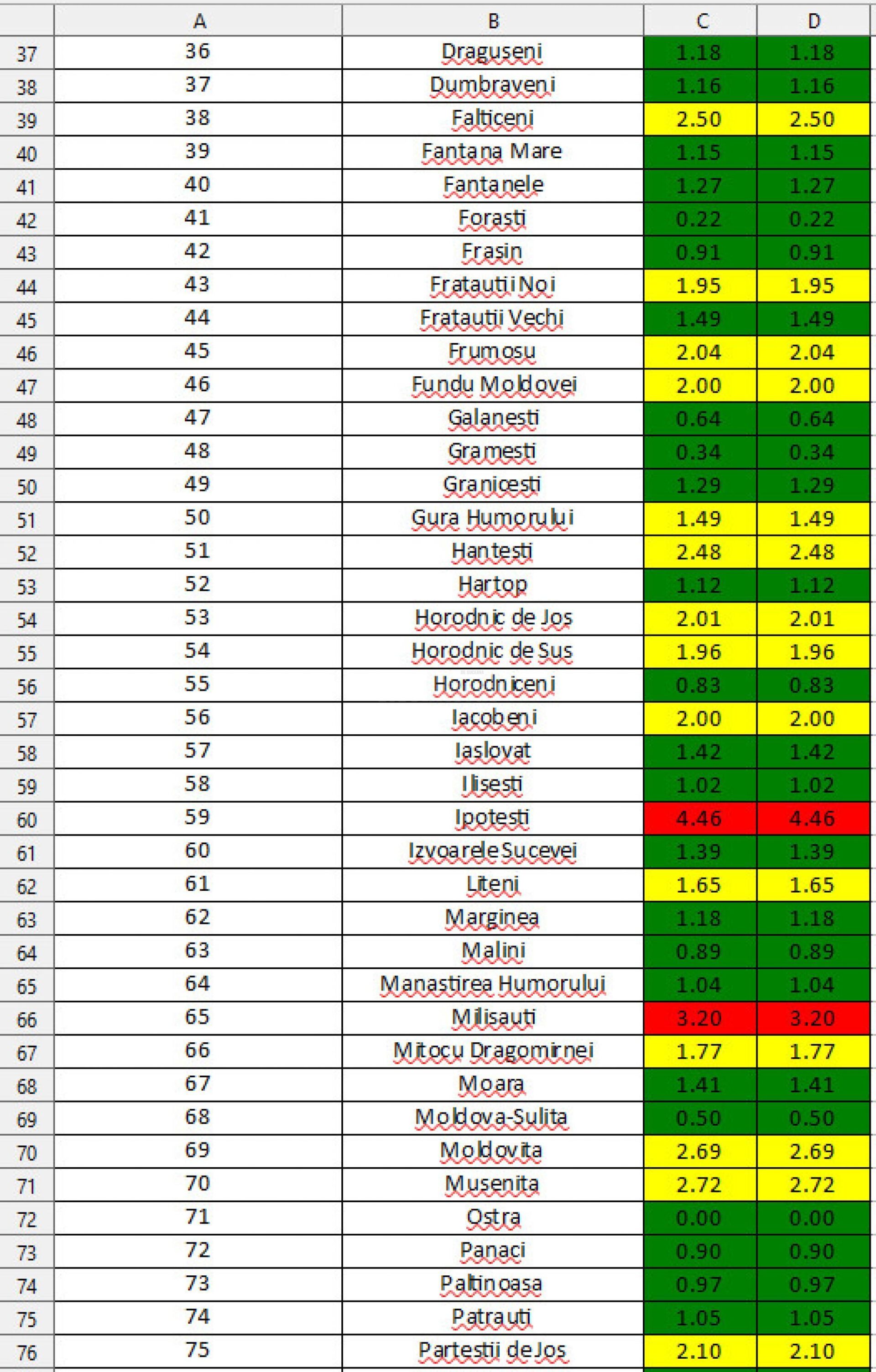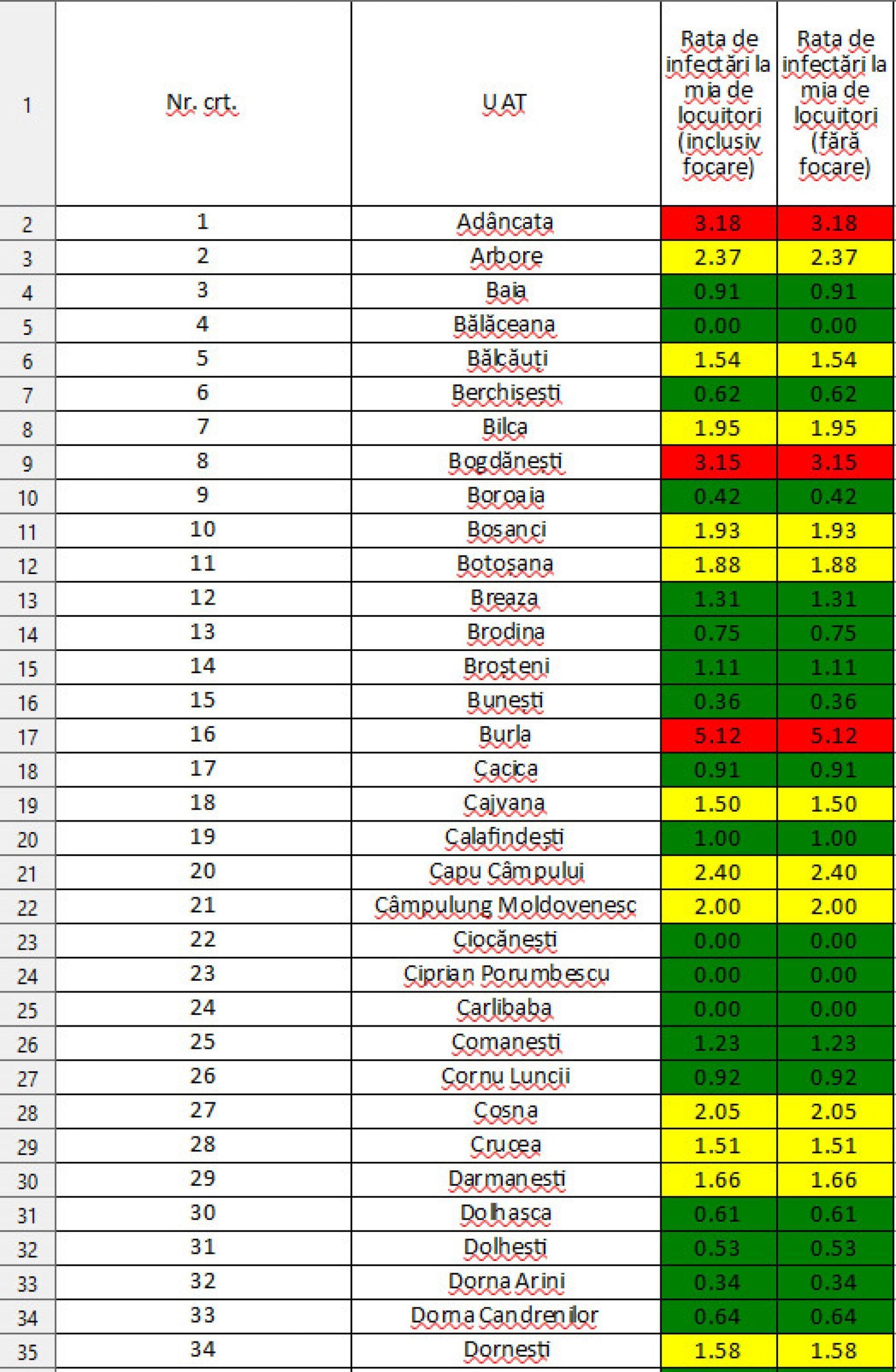 Cele 10 localități aflate în “zona roșie” sunt Adâncata (incidență de 3,18 la mia de locuitori), Bogdănești (incidență de 3,15 la mia de locuitori), Burla (incidență de 5,12 la mia de locuitori), Ipotești (incidență de 4,46 la mia de locuitori), Milișăuți (incidență de 3,20 la mia de locuitori), Rădăuți (incidență de 3,98 la mia de locuitori), Satu Mare (incidență de 3,34 la mia de locuitori), Todirești (incidență de 3,60 la mia de locuitori), Vicovu de Jos (incidență de 3,30 la mia de locuitori) și Volovăț (incidență de 4,12 la mia de locuitori).