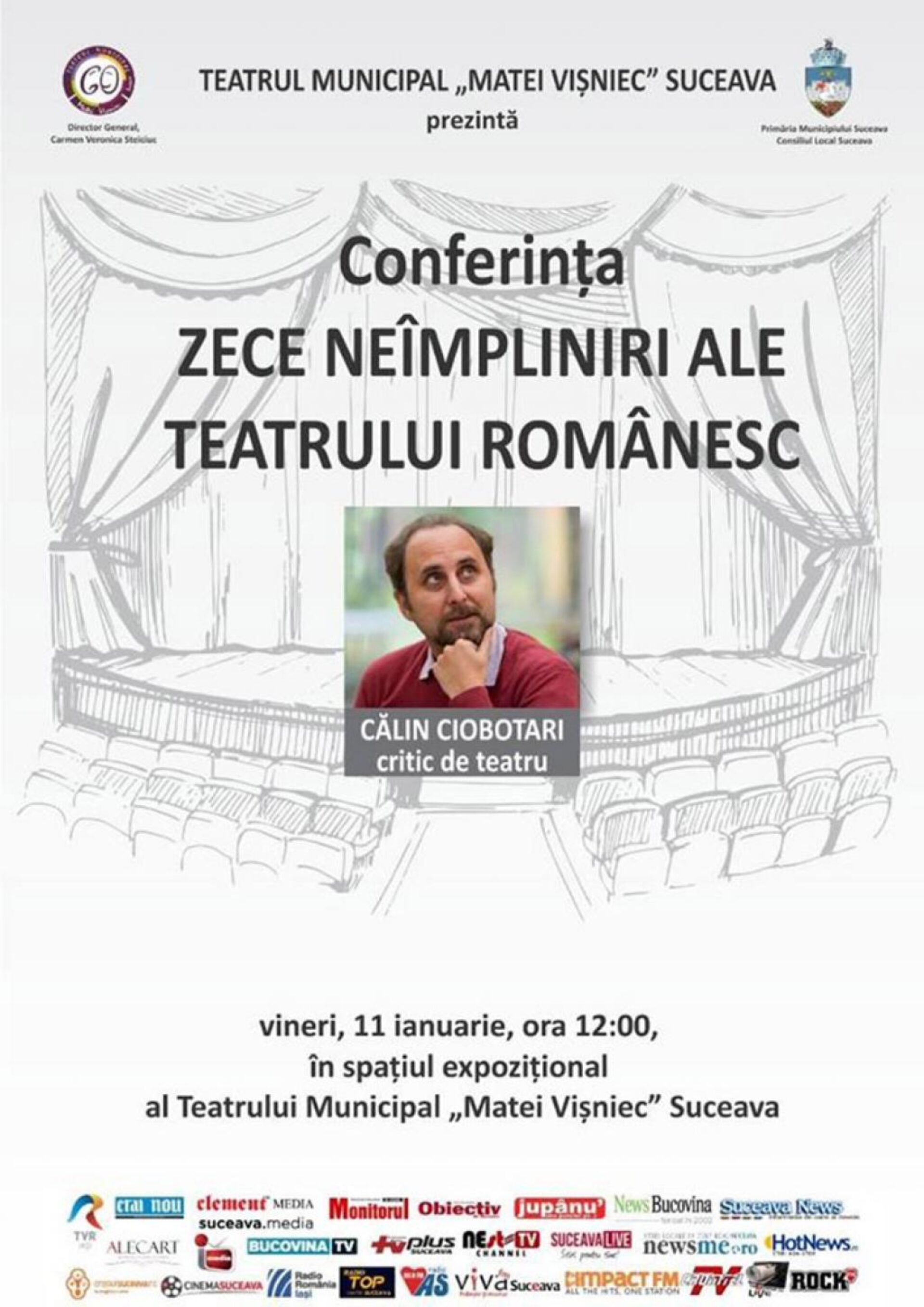 Conferința „Zece neîmpliniri ale Teatrului Românesc”, condusă de criticul de teatru Călin Ciobotari, are loc vineri, 11 ianuarie, de la ora 12:00, în spațiul expozițional al Teatrului Municipal „Matei Vișniec” Suceava.