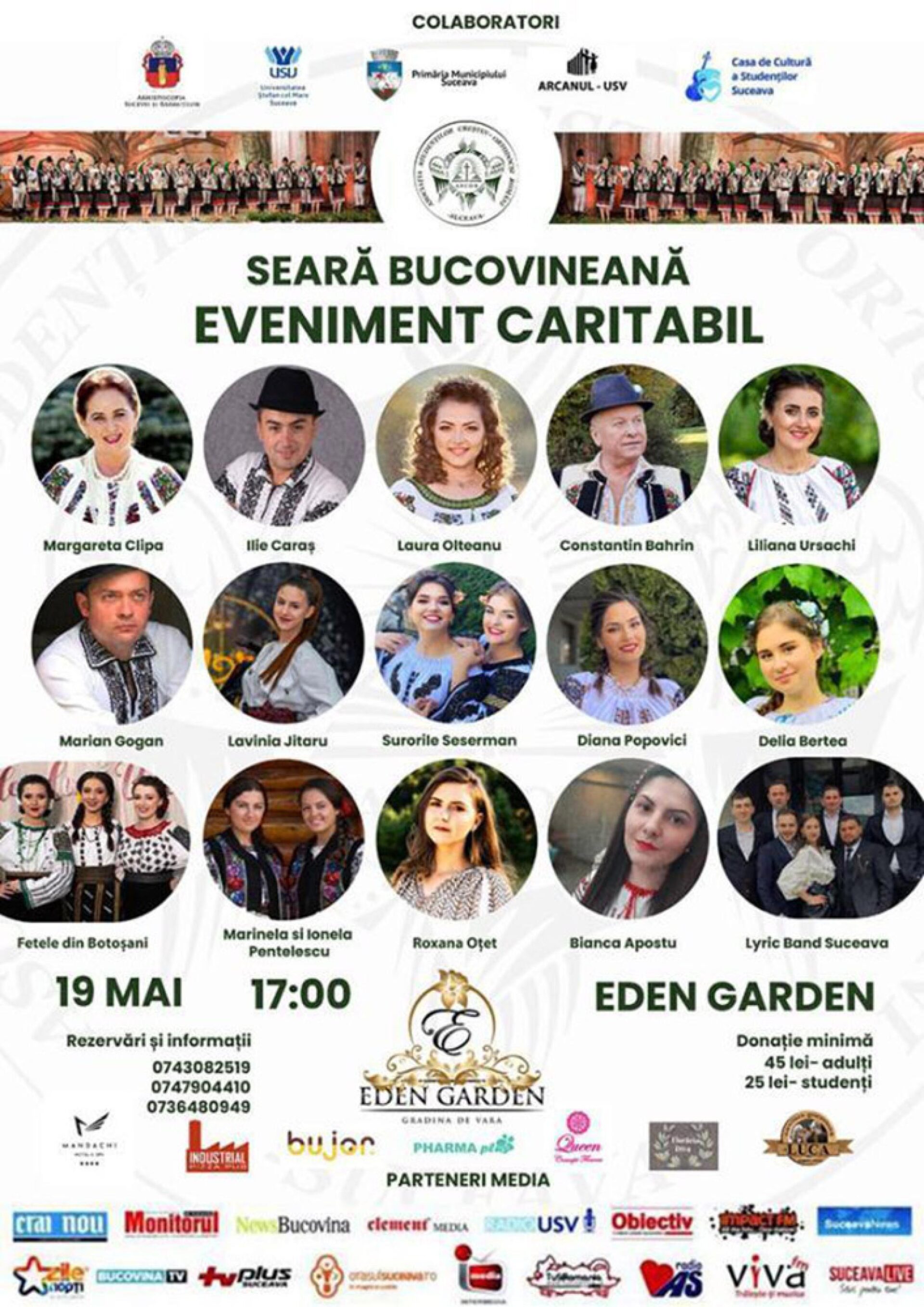 Sunteți invitați la o seară bucovineană, la care jocul, cântecul și voia bună nu vor lipsi datorită unor artiști cunoscuți care au dorit să se implice pentru o cauză umanitară: Margareta Clipa, Laura Olteanu, Ilie Caraș, Constantin Bahrin, Liliana Ursache, Marian Gogan, Lavinia Jitaru, Surorile Seserman, Diana Popovici, Delia Bertea, Surorile Marinela și Ionela Pentelescu, Roxana Oțet, Bianca Apostu. Fetele din Botoșani vor susține un recital, fiind invitate special de organizatori să completeze spectacolul folcloric.