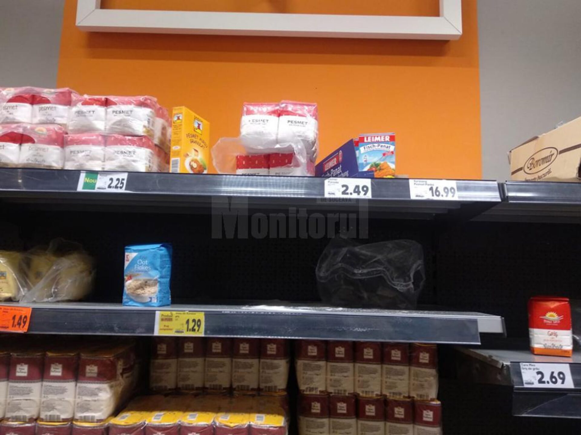 Chiar dacă nu au atins nivelul disperat înregistrat de români în zona de sud a țării, cumpărăturile din marile magazine din Suceava au atins apogeul în cursul zilelor de marți și miercuri, când marfa de pe rafturi întregi a ajuns în cărucioarele clienților panicați. În hipermarketurile din municipiul Suceava s-a vândut în primul rând făina de grâu, rezervele fiind epuizate în depozitele celor câteva mari magazine, iar stocurile la furnizori atingând limita zero. Alte produse care au umplut cărucioarele cumpărătorilor au fost conservele de carne, ale căror stocuri au fost în unele locuri epuizate, alături de conserve de legume și paste făinoase, cu un termen de garanție ceva mai lung. Uleiul rafinat a fost și el un produs foarte solicitat în aceste două zile, alături de apa plată, care a fost cumpărată în cantități foarte mari.