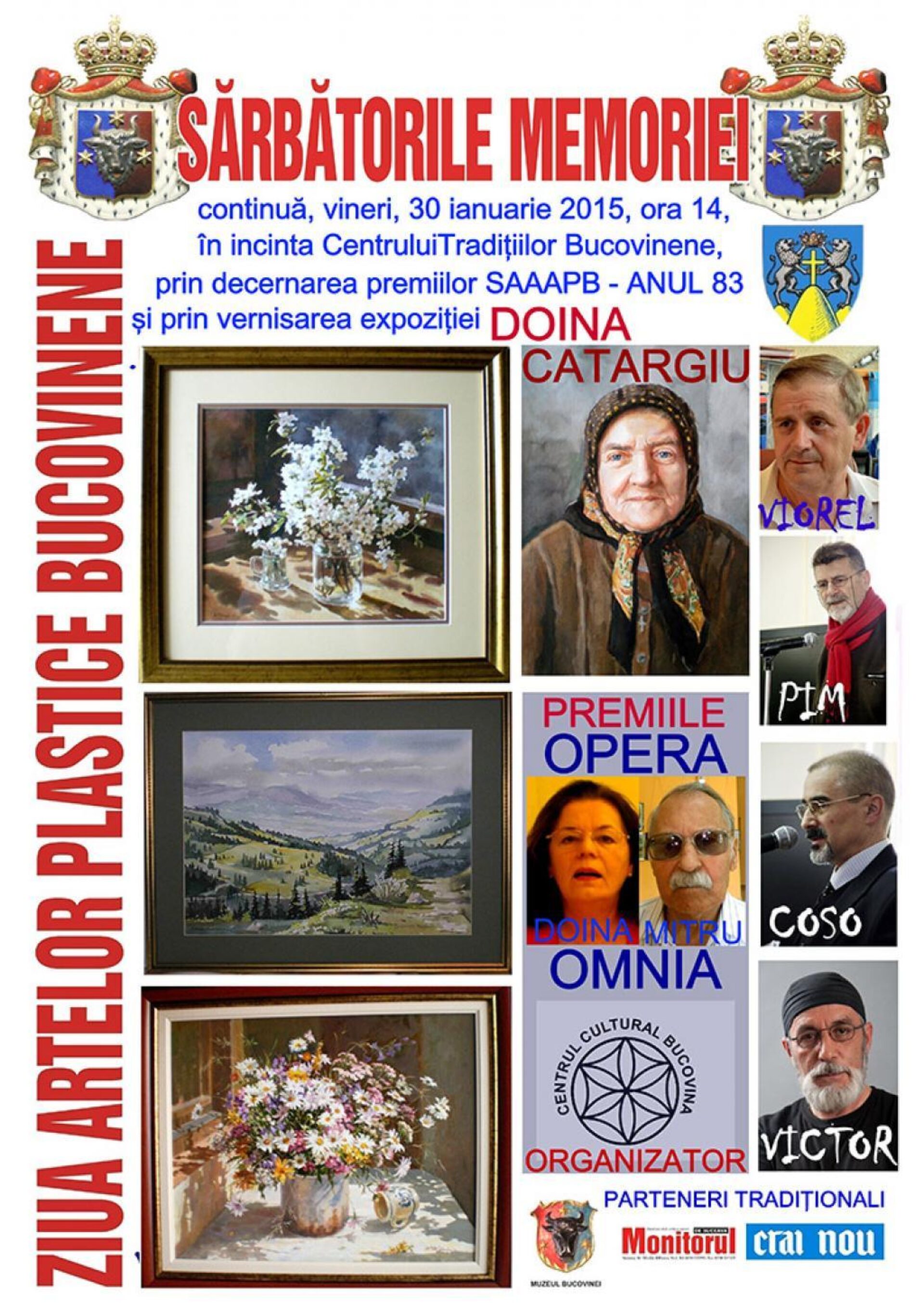 Centrul Cultural Bucovina (CCB), împreună cu partenerii tradiționali Muzeul Bucovinei, Monitorul de Suceava și Crai Nou, organizează vineri, 30 ianuarie, la ora 14.00, în incinta Centrului pentru Susținerea Tradițiilor Bucovinene din municipiul Suceava, o nouă ediție a Sărbătorilor Memoriei dedicată Zilei Artelor Plastice Bucovinene. Va fi vernisată expoziția retrospectivă a artistei plastice Doina Catargiu și vor fi decernate Premiile Societății Artiștilor și Amicilor Artelor Plastice din Bucovina (Premiile Opera Omnia vor fi conferite pictorilor Doina Catargiu și Dimitrie Savu). Prezintă Viorel Varvaroi – managerul CCB, Victor T. Rusu – directorul Centrului pentru Conservarea și Promovarea Culturii Tradiționale Suceava, artistul plastic Mihai Pânzaru PIM, jurnalistul și graficianul Tiberiu Cosovan.