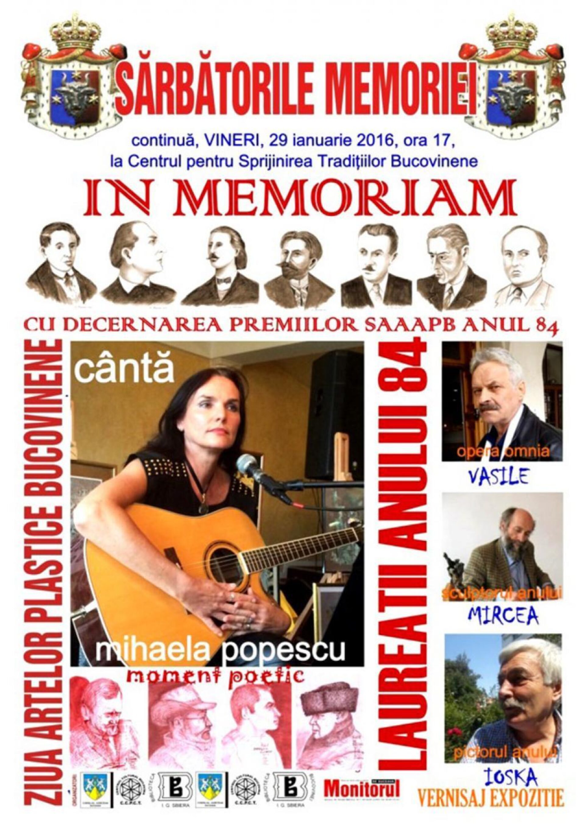 Circumscrisă ciclului de manifestări cu genericul „Sărbătorile Memoriei”, Ziua Artelor Plastice Bucovinene (care are ca fundament ziua de 31 ianuarie 1932, când, la Cernăuți, s-au pus bazele Societății Artiștilor și Amicilor Artelor Plastice din Bucovina), organizată sub egida Consiliului Județean Suceava de Centrul Cultural Bucovina, Biblioteca Bucovinei „I.G. Sbiera” și Monitorul de Suceava, cuprinde în program vernisarea expoziției de artă plastică realizată cu lucrările laureaților ediției din acest an, decernarea premiilor „Opera Omnia”, „Sculptorul anului” și „Pictorul anului” și spectacolul de muzică și poezie susținut de interpreta și cantautoarea de muzică folk Mihaela Popescu și poeții Roman Istrati, Victor T. Rusu, Dorin Liviu Clement și Ion Drăgușanul.