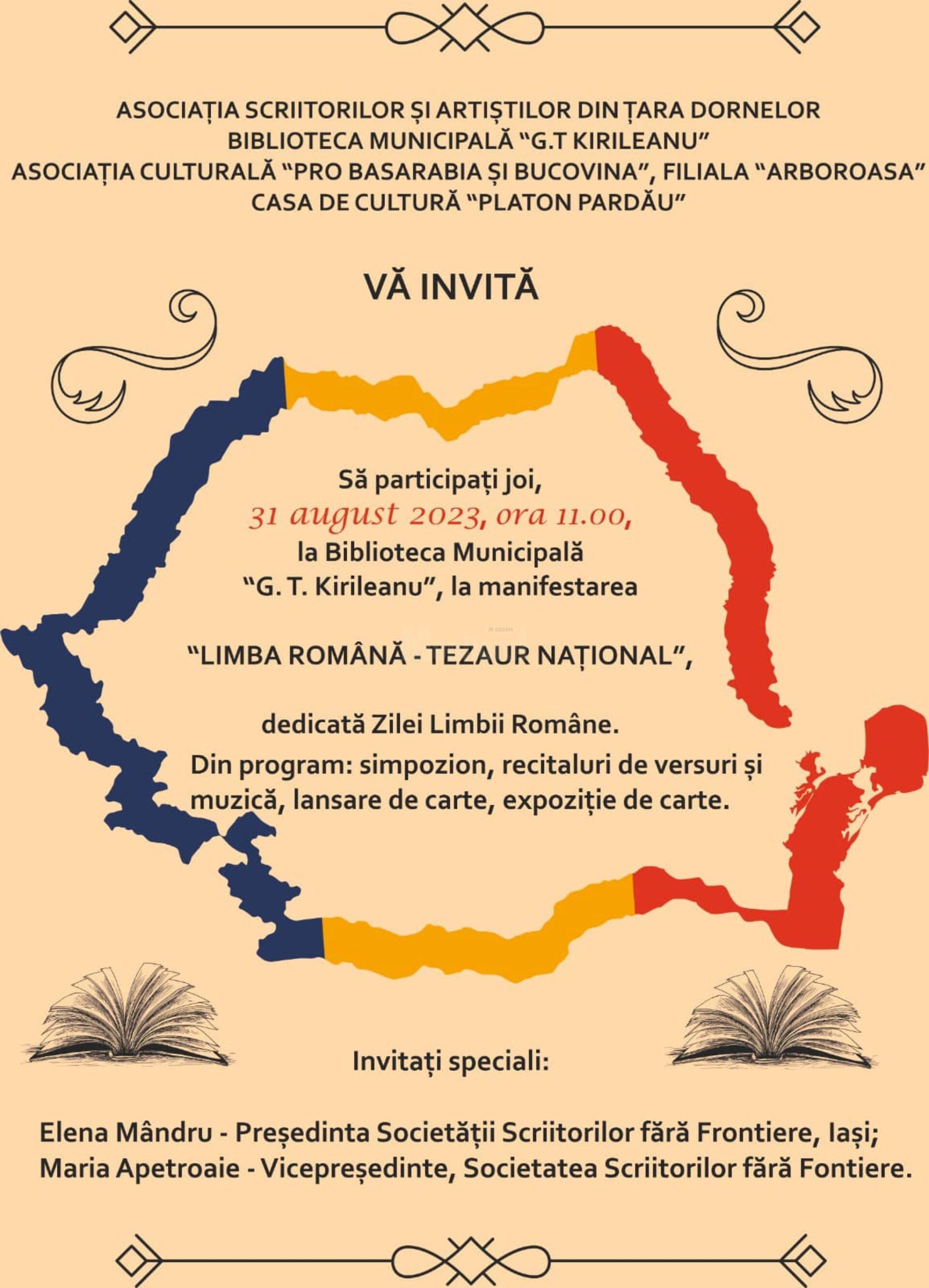 La Biblioteca Municipală „G. T. Kirileanu” Vatra Dornei vor avea loc joi, 31 august 2023, începând cu ora 11:00, mai multe activități culturale dedicate Zilei Limbii Române. Adunate sub titlul „Ziua Limbii Române – Tezaur Național”, dornenii și nu numai sunt așteptați să participe la un simpozion, un recital de versuri și muzică, lansări de carte și o expoziție de carte.