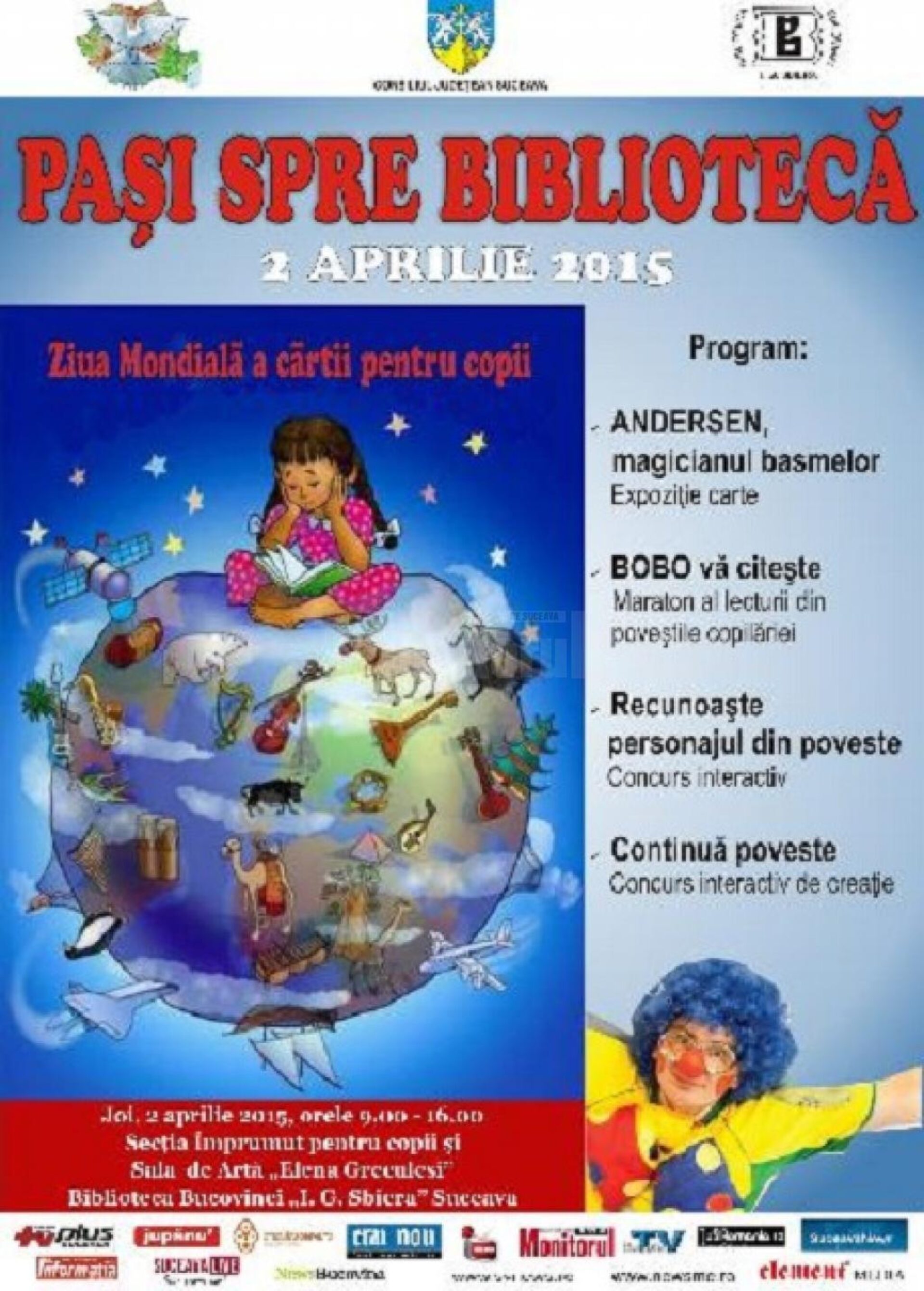Ziua Mondială a Cărții pentru Copii va fi marcată joi, 2 aprilie, între orele 9.00 – 16.00, la Biblioteca Bucovinei „I.G. Sbiera” Suceava, prin activitatea cu genericul „Pași spre bibliotecă”.Programul, care se va desfășura în Secția de Împrumut pentru Copii și în Sala de Artă „Elena Greculesi”, va cuprinde expoziția de carte „Andersen, magicianul basmelor”, „Bobo vă citește” – un maraton de lectură cu poveștile copilăriei, concursul interactiv „Recunoaște personajul din poveste” și concursul de creație „Continuă povestea”.