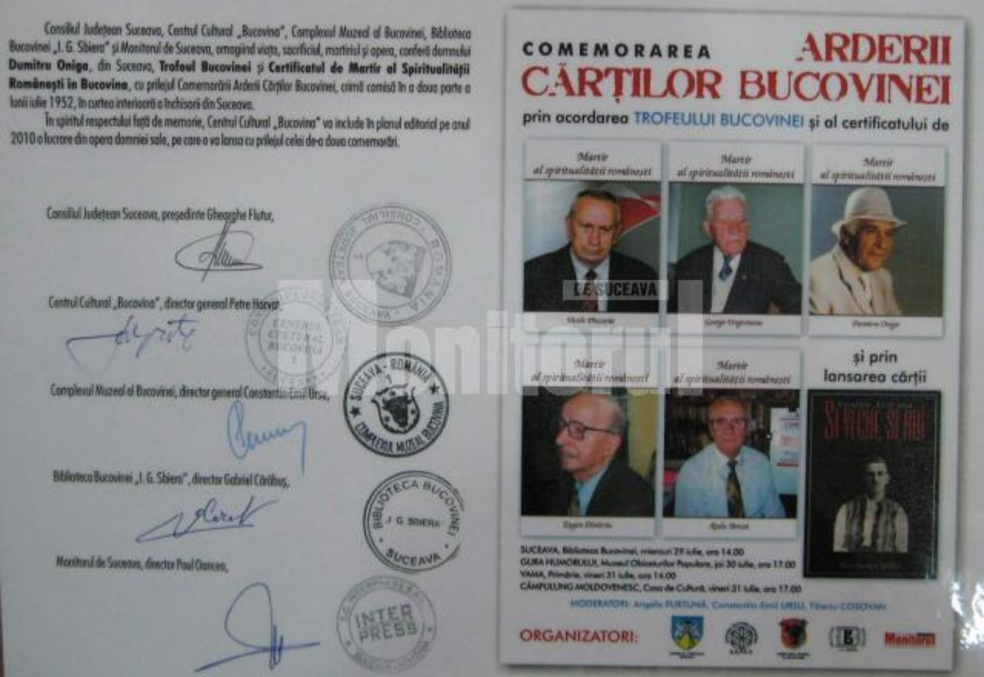 Evenimentul, care s-a circumscris complexului de manifestări cu genericul “Comemorarea arderii cărților Bucovinei”, manifestări care au debutat în dimineața aceleiași zile la Muzeul Satului Bucovinean, cu ceremonia sfințirii țărânii martirilor Dumitru Cătană și Zamfir Nicoară și așezarea acesteia în culcușul primitor al mormântului simbolic al eroismului bucovinean, i-a avut ca protagoniști pe cărturarul, monograful și reputatul genealogist Eugen Dimitriu și pe poeții cuvântului răstignit Dumitru Oniga și Vasile Pânzariu.