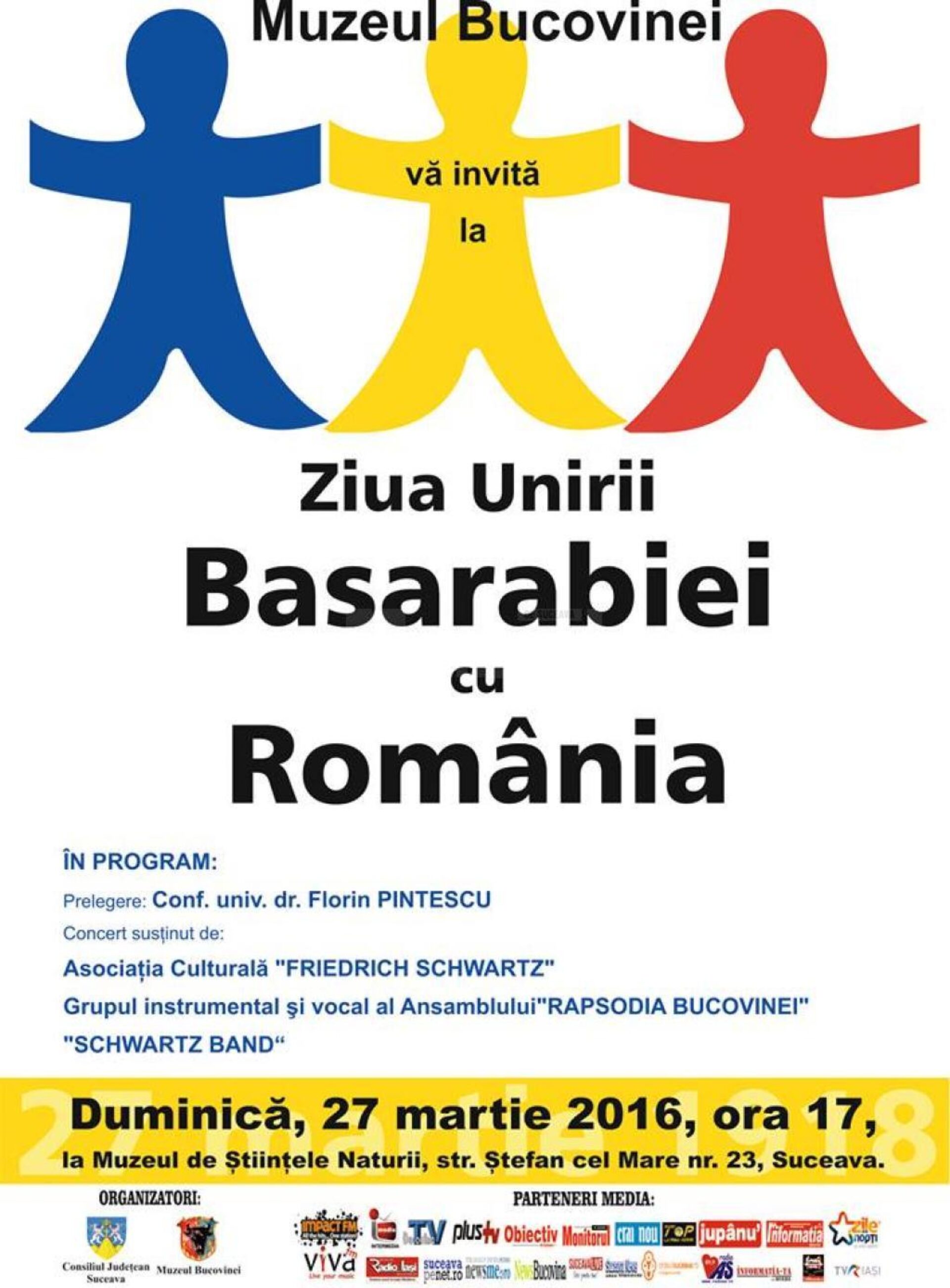 Muzeul Bucovinei organizează duminică, 27 martie a.c., la ora 17.00, la Muzeul de Științele Naturii din municipiul Suceava, o manifestare dedicată Zilei Unirii Basarabiei cu România.