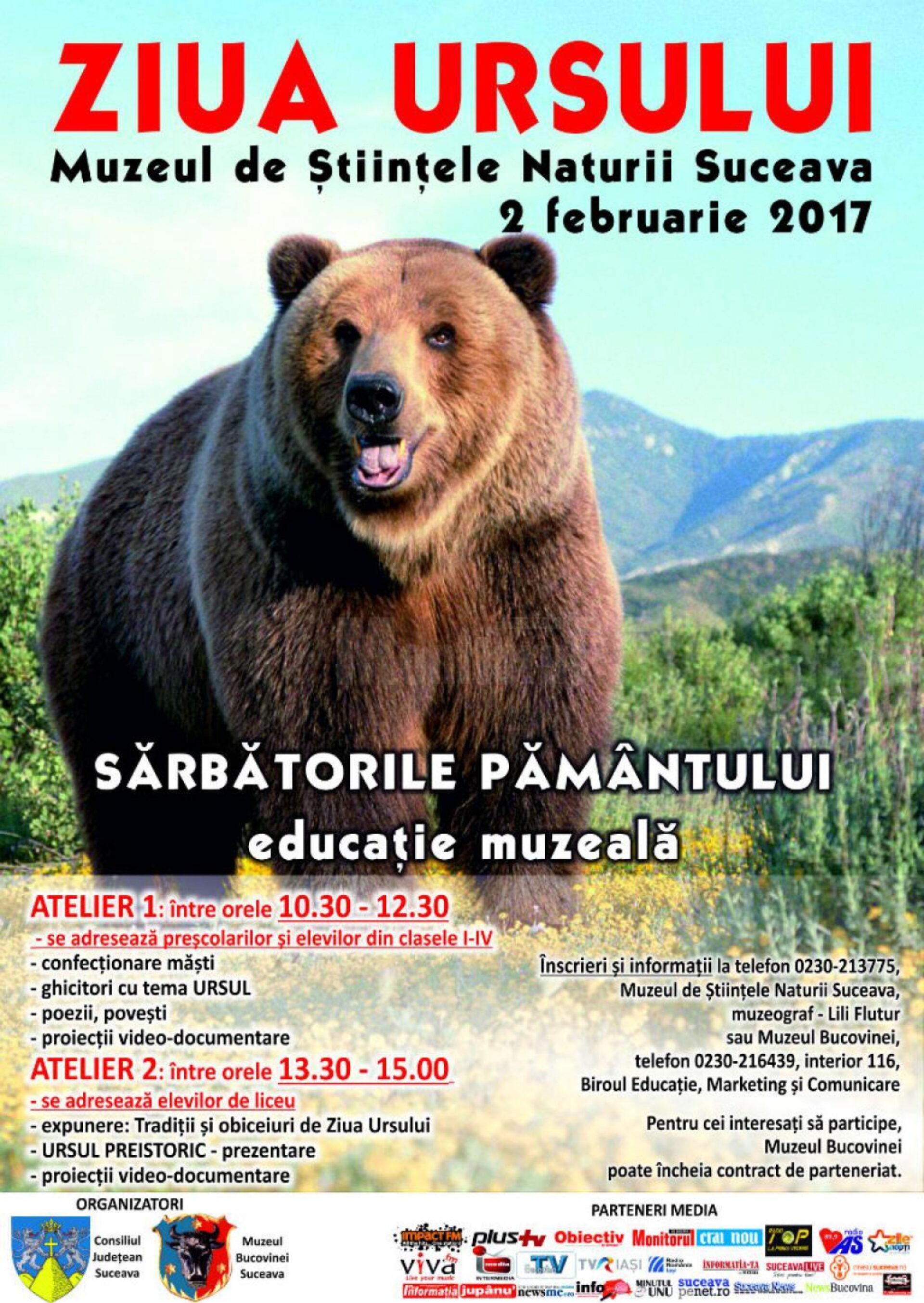 Vor fi organizate două ateliere, primul, între orele 10.30-12.30, adresat preșcolarilor și elevilor din clasele I-IV, care include confecționare măști, ghicitori tematice, poezii și povești, precum și proiecții video-documentare, cel de-al doilea, programat între orele 13.30-15.00, care se adresează elevilor de liceu, va cuprinde expunerea „Tradiții și obiceiuri de Ziua ursului”, prezentarea „Ursul preistoric” și proiecții video-documentare.